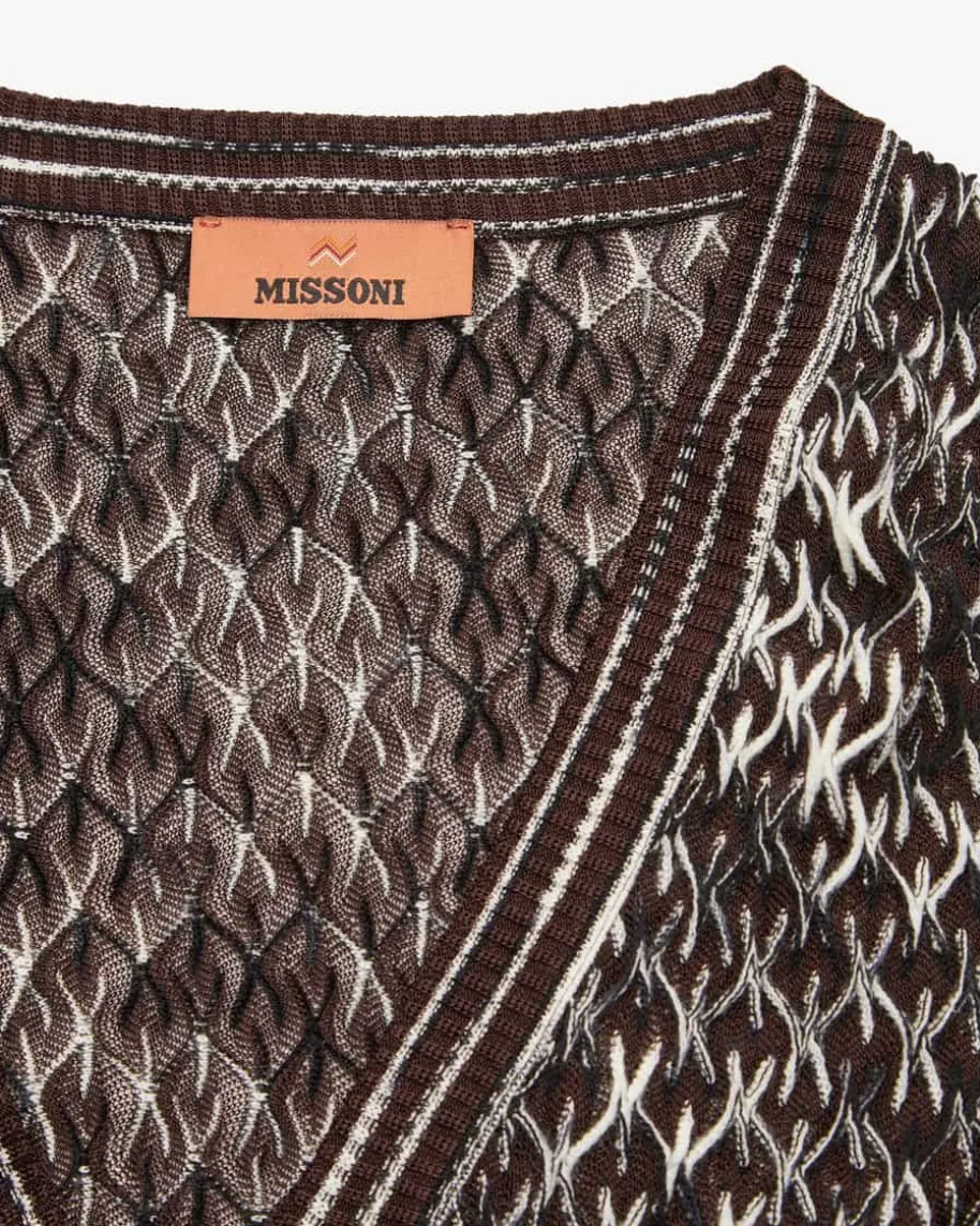 Pullover für Damen von Missoni in Dunkelbraun, Weiß und Schwarz. Dasitalienische Modehaus ist bekannt für farbenfrohe Strickkunst & Zickzack-Muster.Auch dieses Modell überzeugt im einzigartigen Strick-Design mit semi-transparenter Verarbeitung und leichtem Wolle-Viskose-Mix. Die weite Passformmit überschnittenen Schultern schaffen einen legeren Style mit dem gewissenEtwas. Das Modell kann mit der passenden Hose als Set getragen werden.