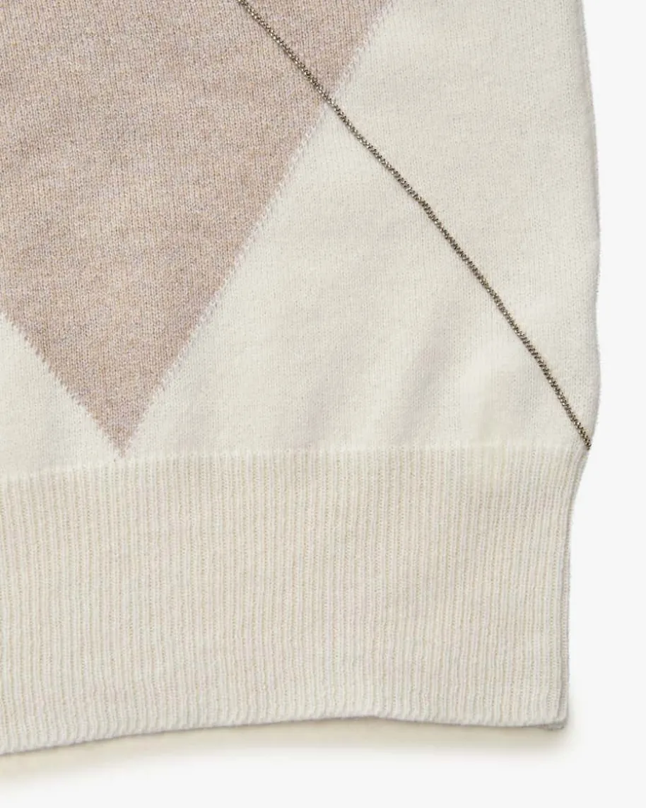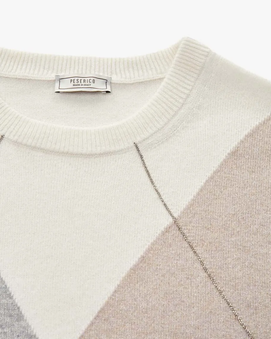 Pullunder für Damen von Peserico in Creme, Hellgrau und Sand. Das Modell ausedler Schurwoll-/Seiden-Qualität präsentiert sich mit legerem Oversize-Fitmodisch, während das Rauten-Dessin für einen klassischen Charakter sorgt. DieGlitzer-Details setzen zusammen mit den labelypischen Schmuckketten-Applikationen zudem besondere Akzente.