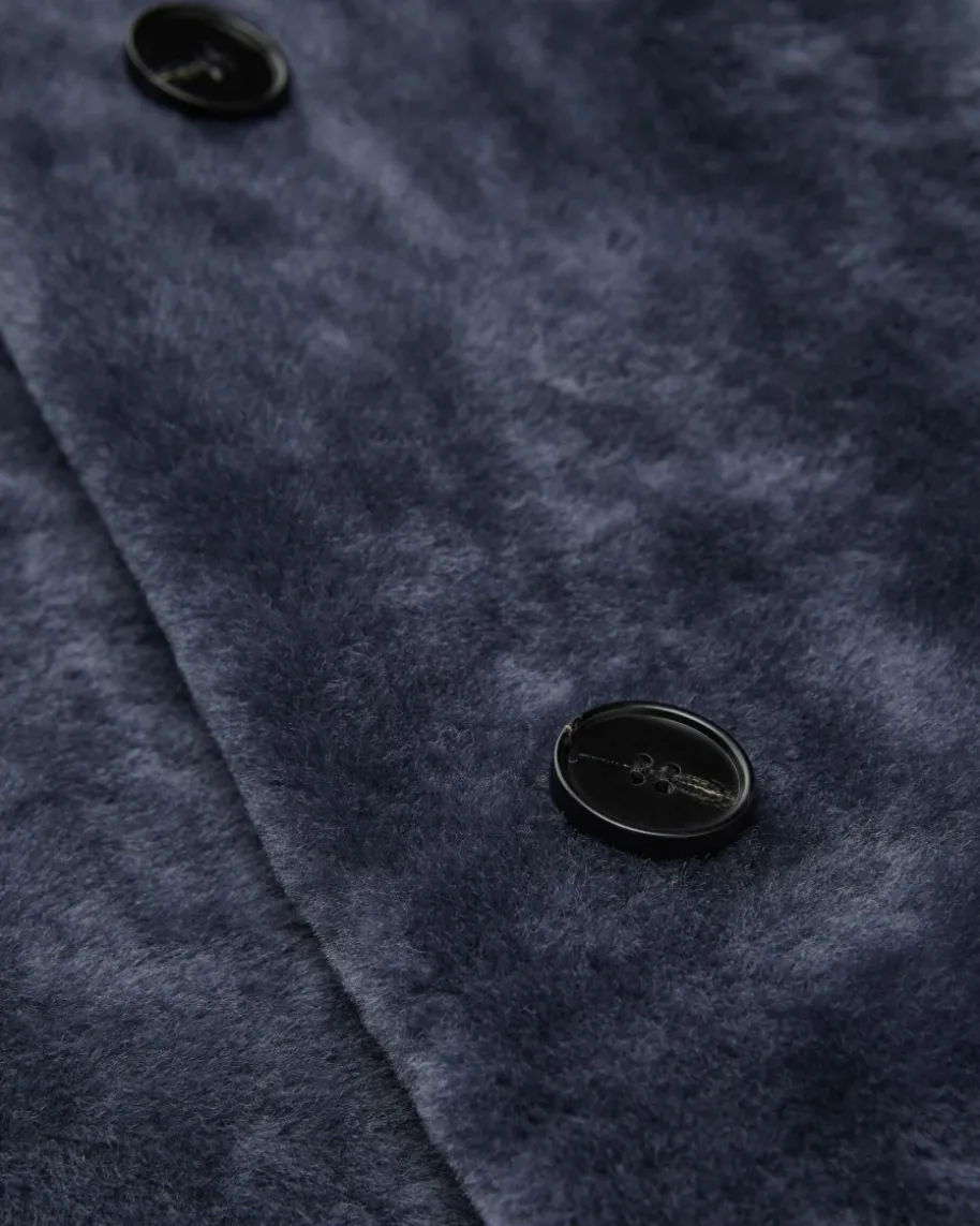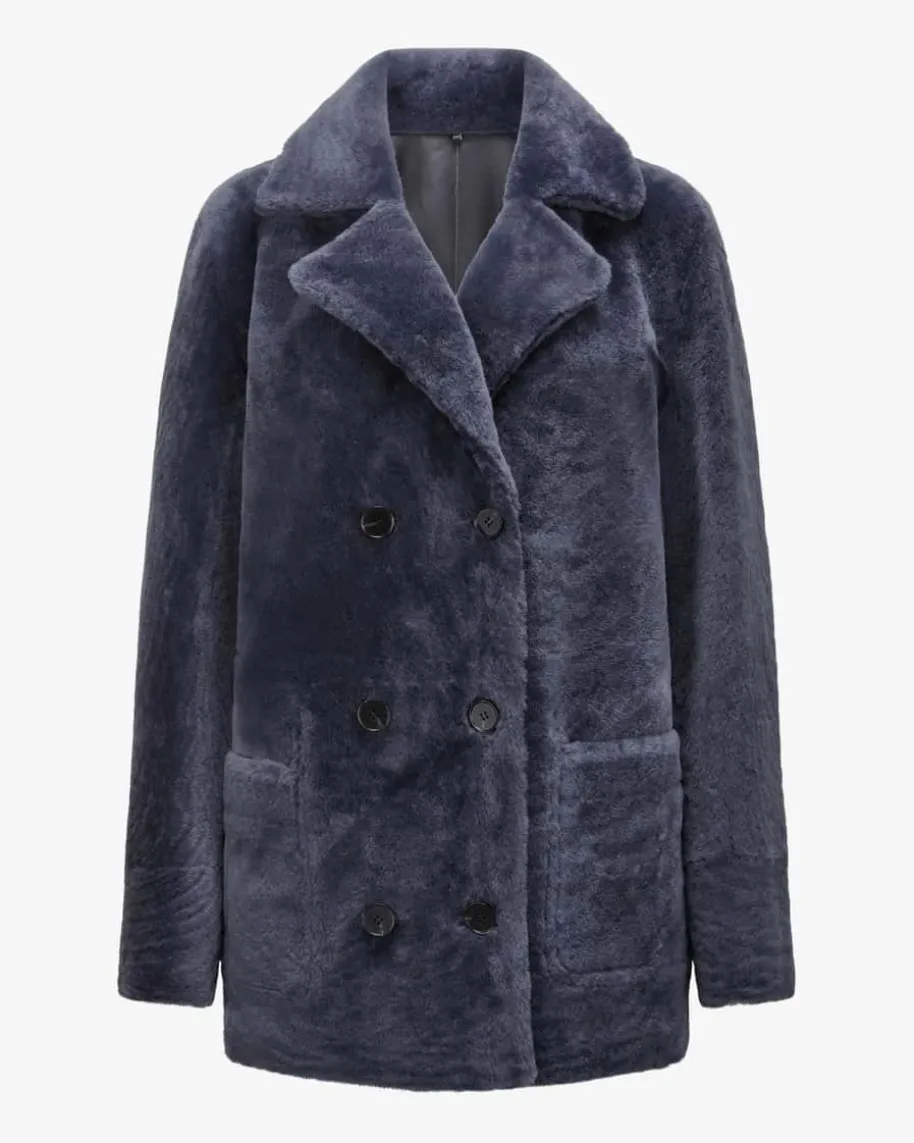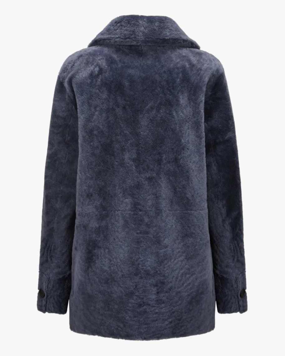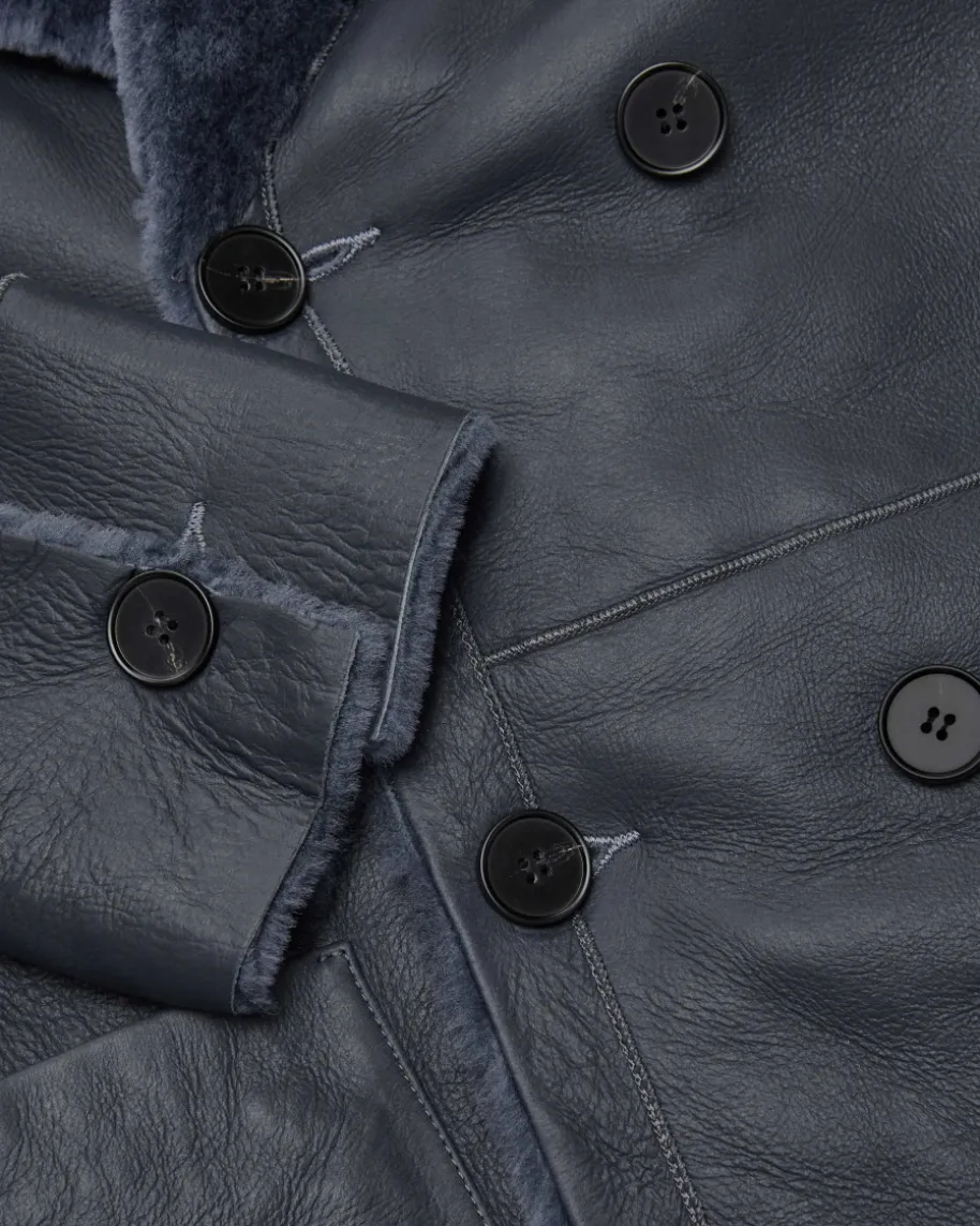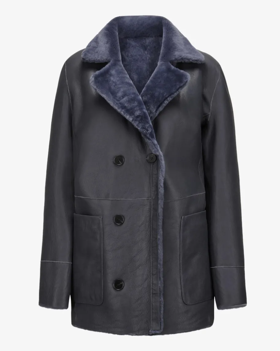 Rachel Schaffelljacke für Damen von Nove in Dunkelblau. Die Marke ist bekanntfür hochwertige Essentials mit Fokus auf Klarheit, Funktionalität und femininerSilhouette. Das Modell zeichnet sich durch die Verwendung von hochwertigemLammleder aus, während die Fell-Innenseite mit seiner weichen und wärmendenEigenschaft optisch sowie haptisch punktet. Zugleich verleiht die zweireihigeAufmachung mit Reverskragen einen modischen Charakter.