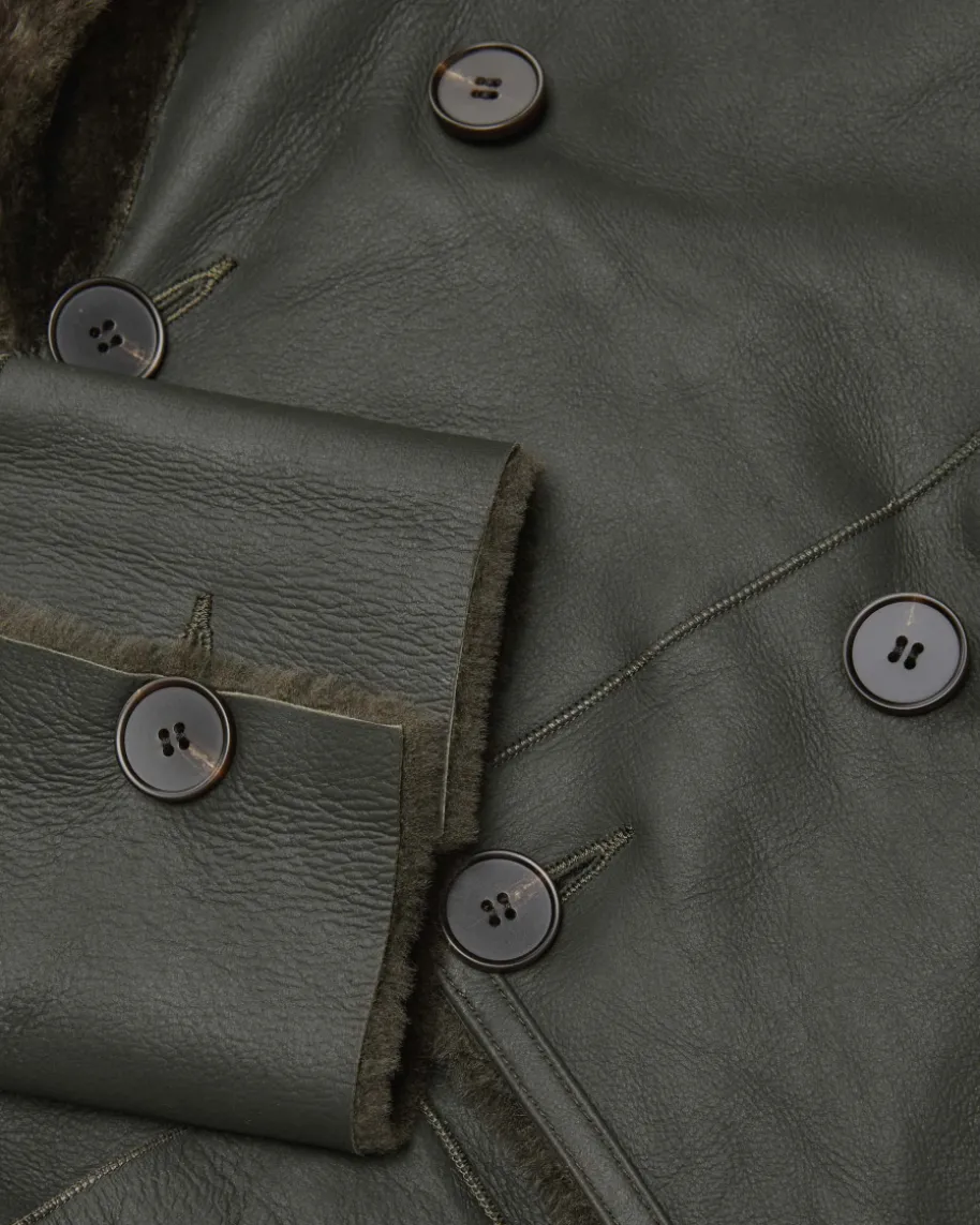 Rachel Schaffelljacke für Damen von Nove in Dunkeloliv. Die Marke ist bekanntfürhochwertige Essentials mit Fokus auf Klarheit, Funktionalität und femininerSilhouette. Das Modell zeichnet sich durch die Verwendung von hochwertigemLammleder aus, während die Fell-Innenseite mit seiner weichen und wärmendenEigenschaft optisch sowie haptisch punktet. Zugleich verleiht die zweireihigeAufmachung mit Reverskragen einen modischen Charakter.