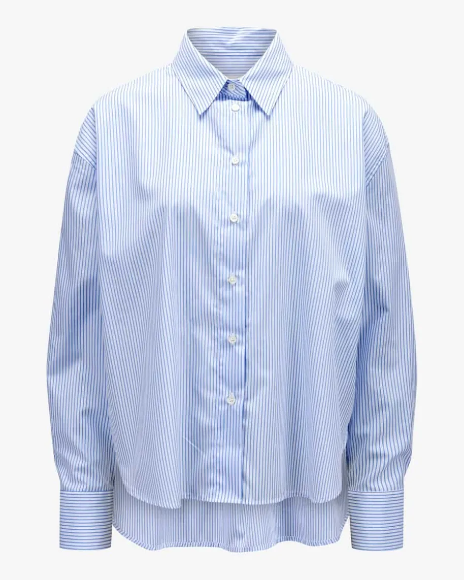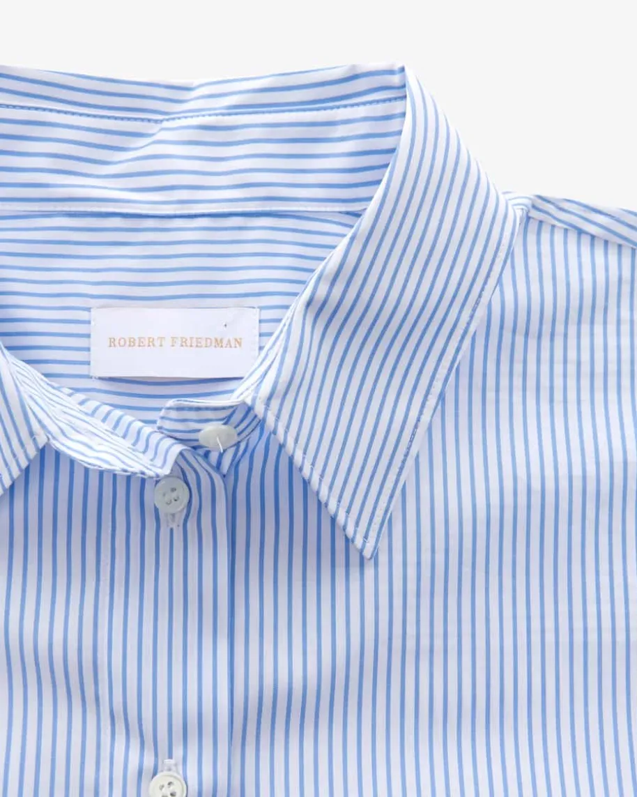 Renee Hemdbluse für Damen von Robert Friedman in Blau und Weiß. Das Modell inhochwertiger Baumwoll-Qualität überzeugt mit angenehmen Tragemomenten, währenddas Streifen-Dessin einen modernen Begleiter für vielseitige Styles schafft.