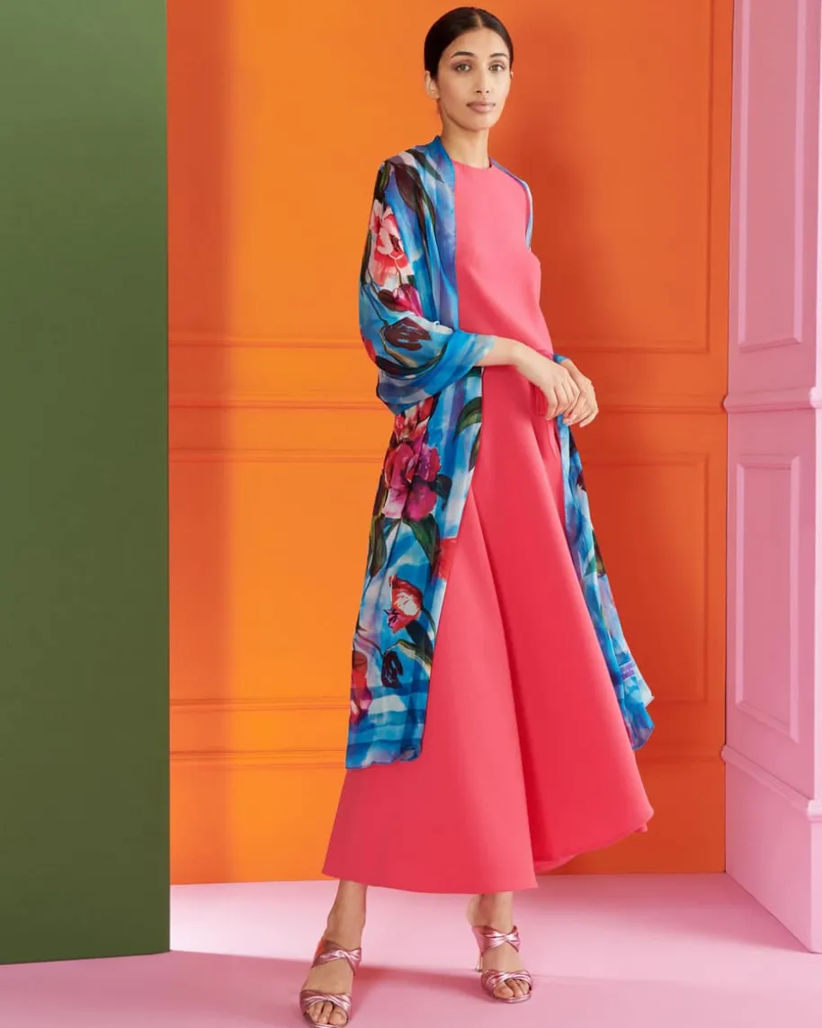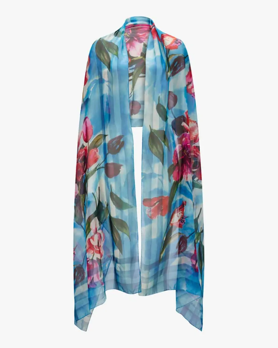 Ritzi1 Seiden-Cape für Damen von Talbot Runhof in Blau und Bunt. Während dieedle Seiden-Qualität sowohl haptisch als auch optisch überzeugt, setzt dasflorale Dessin zusammen mit der semitransparenten Optik feminine Akzente.