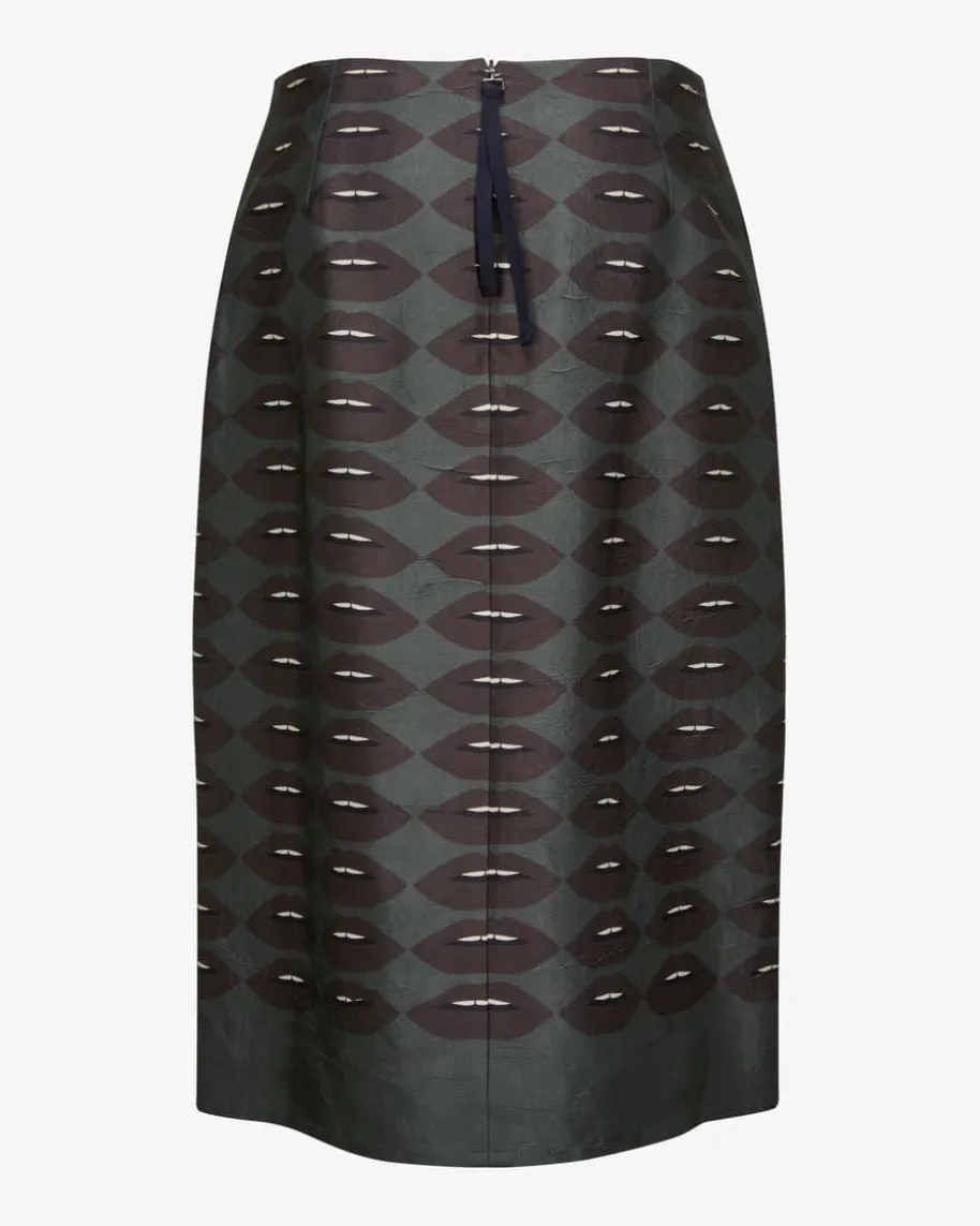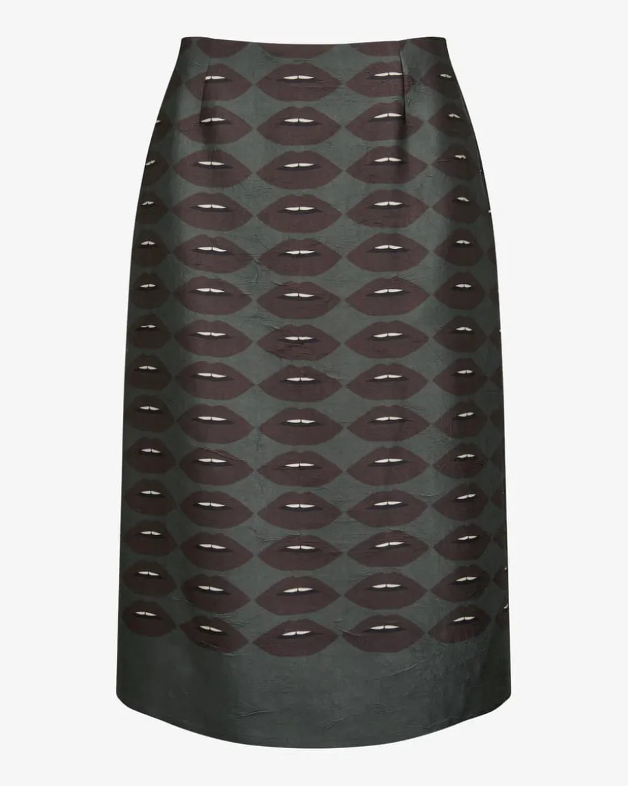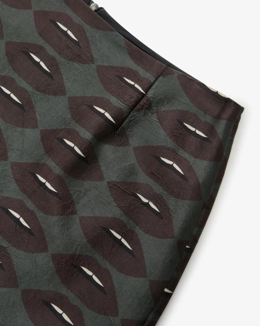 Rock für Damen von Odeeh in Dunkelgrün, Braun und Creme. Dank der fließendenSatin-Qualität in Knitter-Aufmachung punktet das ausgestellte Modell mit einerangenehmen Haptik und stilvollen Optik, während das originelle Lippen-Dessin einmodisches Gesamtbild im Dark Romance-Stil kreiert. Für einen femininen Power-Look können Sie die passende Bluse kombinieren.