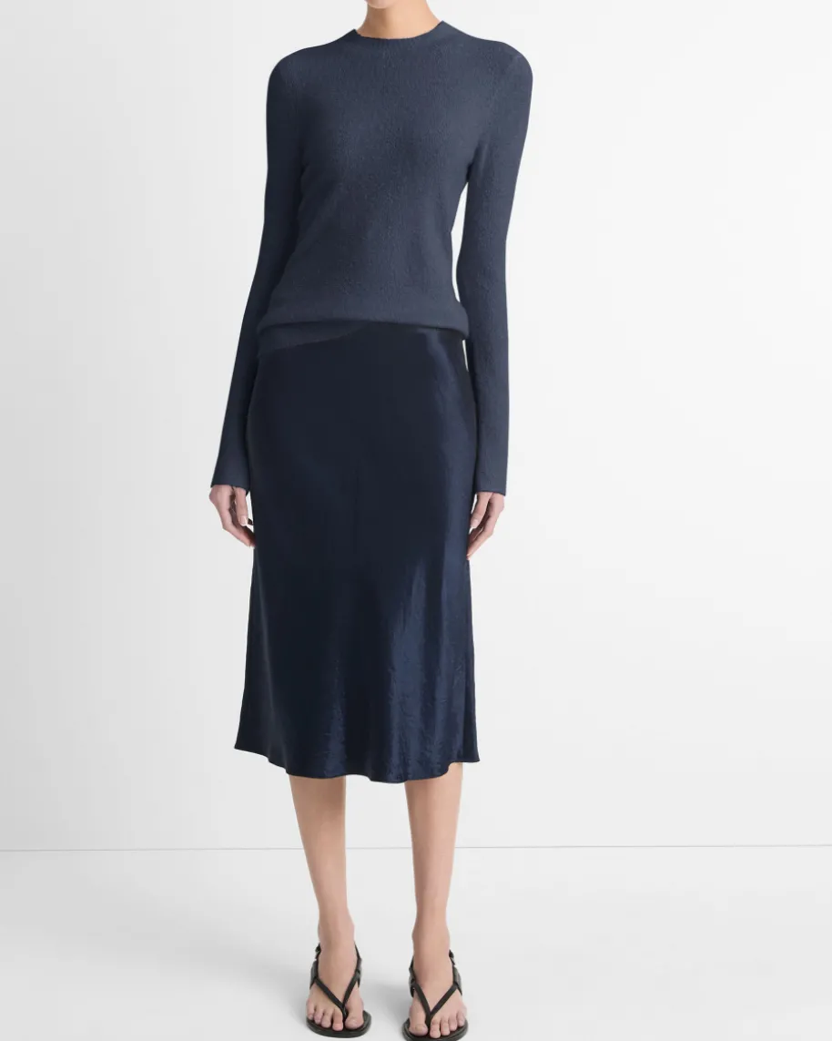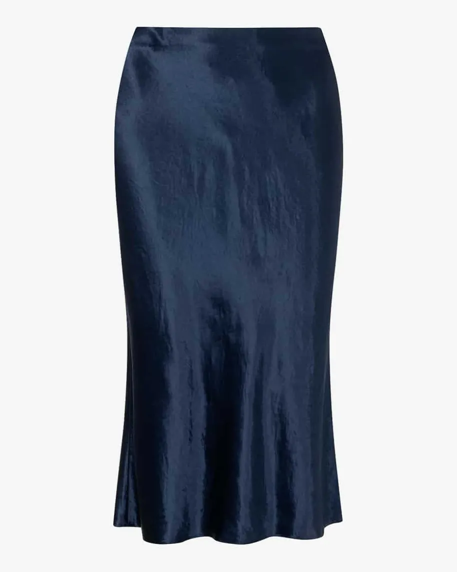 Rock für Damen von Vince in Dunkelblau. Das Modell präsentiert sich in edelchangierender Optik, während das cleane Design mit der fließenden Stoff-Qualitätgekonnt harmoniert.