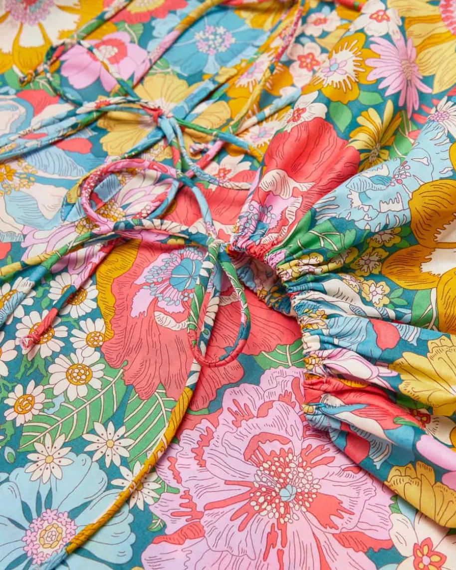 Ruby Bluse für Damen von biscuits. luxury essentials in Bunt. Das Modell ausleichter Baumwoll-Qualität begeistert mit luftiger sowie dank Raffungenverspielter Aufmachung. Der tiefe V-Ausschnitt mit raffinierter Schnürung rundetden Look zusammen mit dem modischem Allover-Print stilvoll ab.