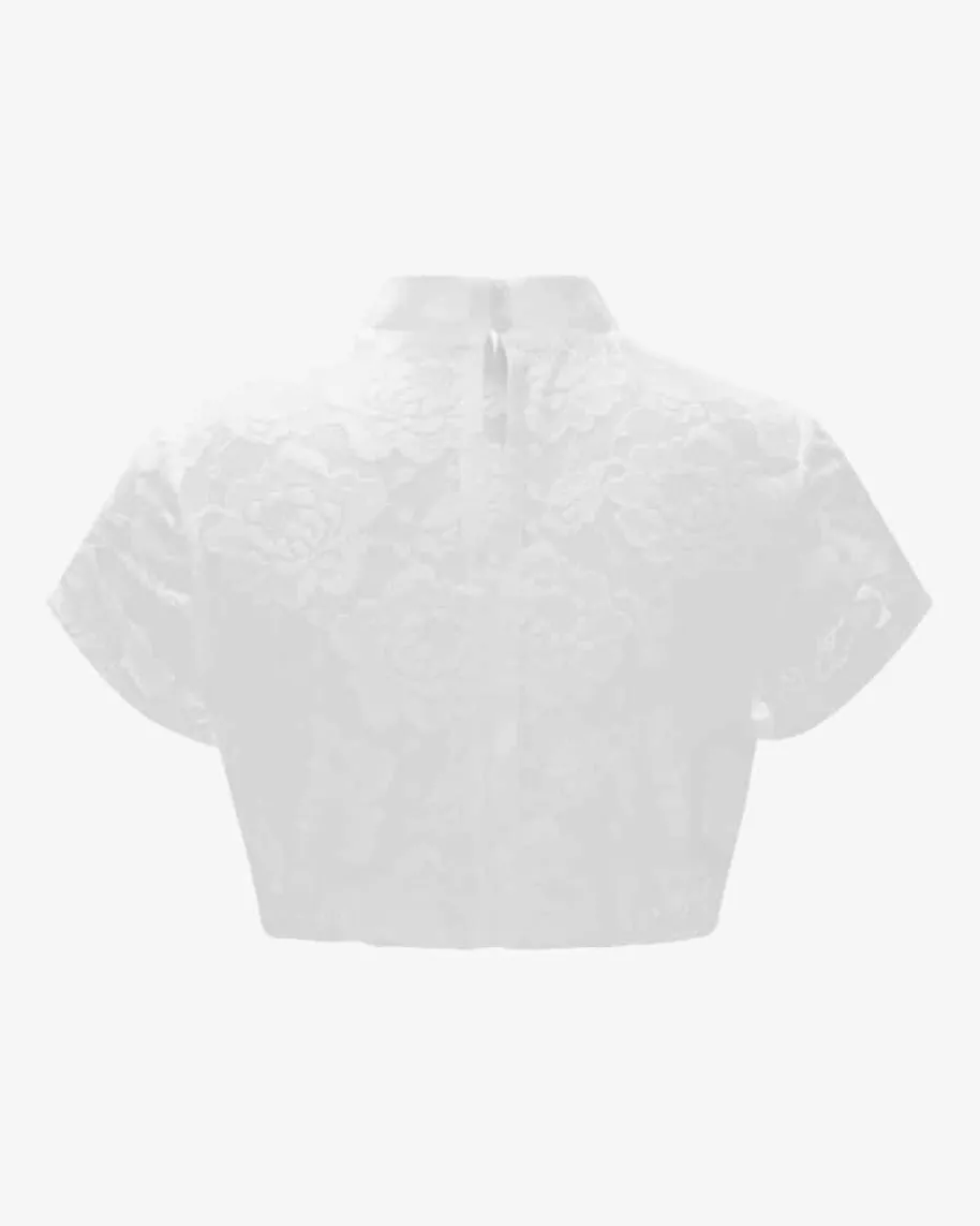 Sabrina Dirndlbluse für Damen von Susanne Spatt in Weiß. HandgearbeiteteTrachtenmode aus Salzburg – Das semitransparente Modell erhält dank der floralenSpitze eine feminine Leichtigkeit.