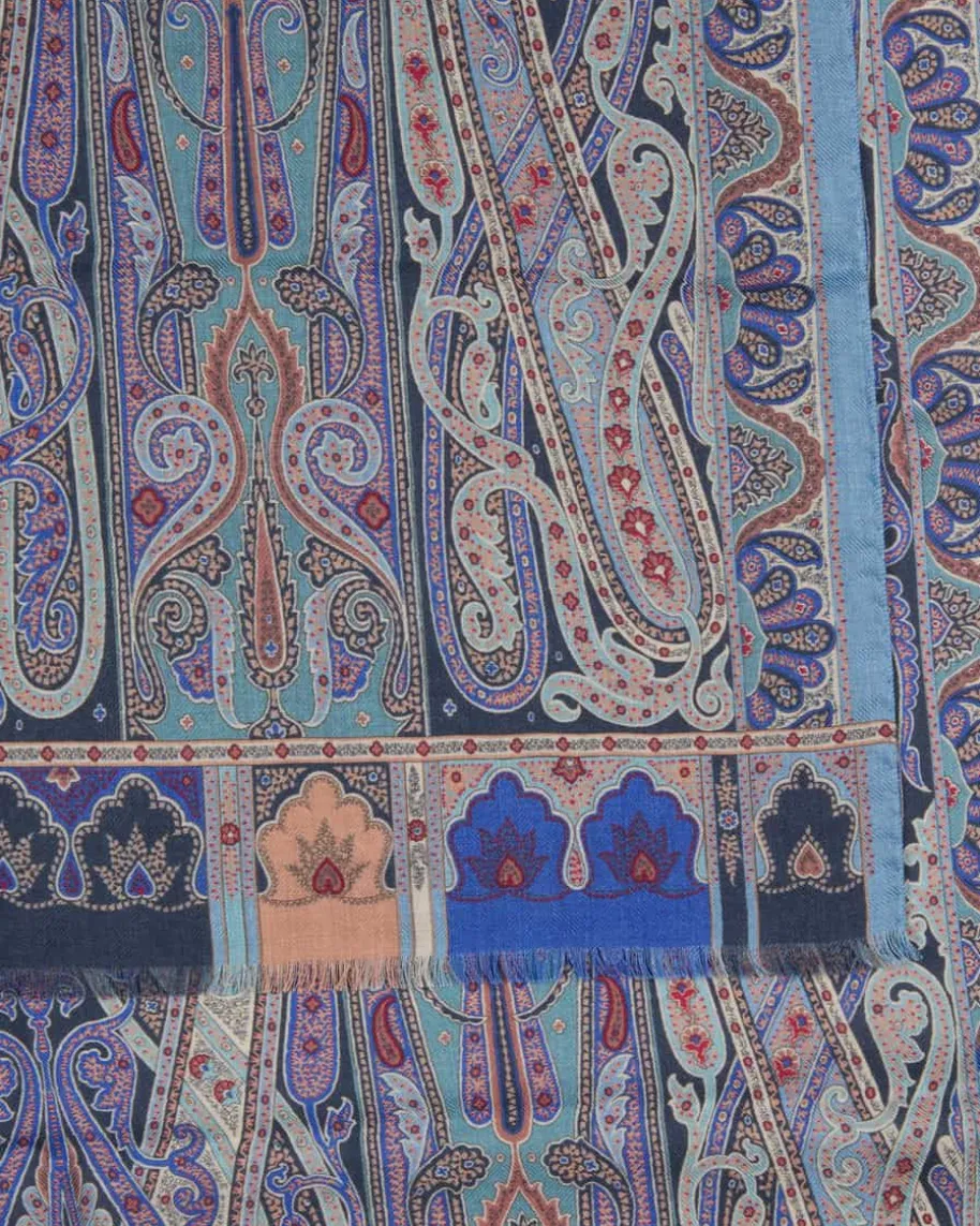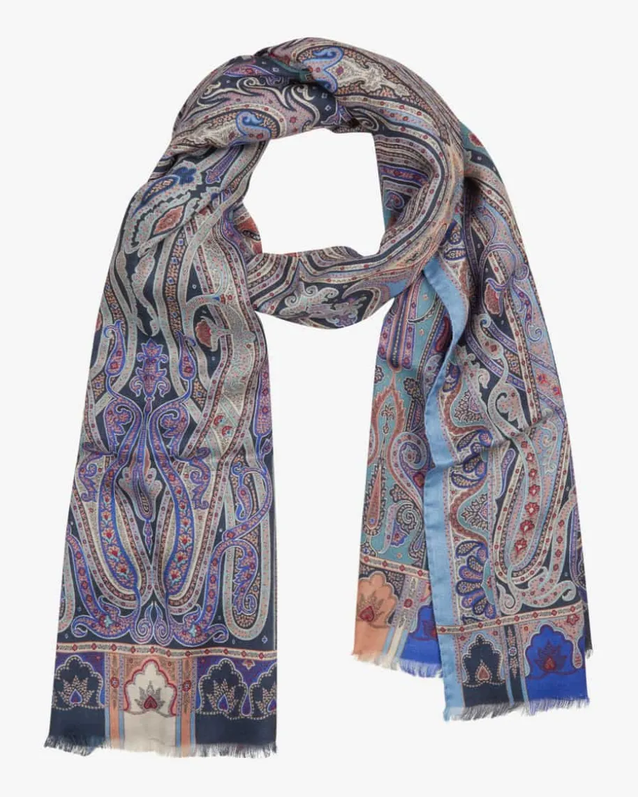 Cashmere-Seiden-Schal für Damen von Etro in Hellblau, Petrol und Terrakotta.Während das farbenfrohe Paisley-Muster einen modischen Eyecatcher kreieren,schmiegt sich die hochwertige Cashmere-Seiden-Verarbeitung angenehm an Ihre Hautan.