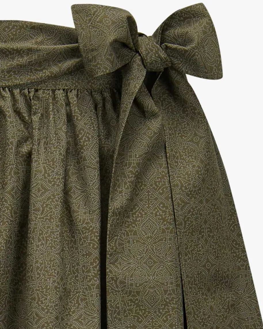 Schürze für Damen von LODENFREY in Oliv. Das Modell präsentiert sich mitleichter Baumwoll-Qualität und feinem Ornament-Muster – Ein femininer Begleiterfür vielseitige Trachten-Looks.