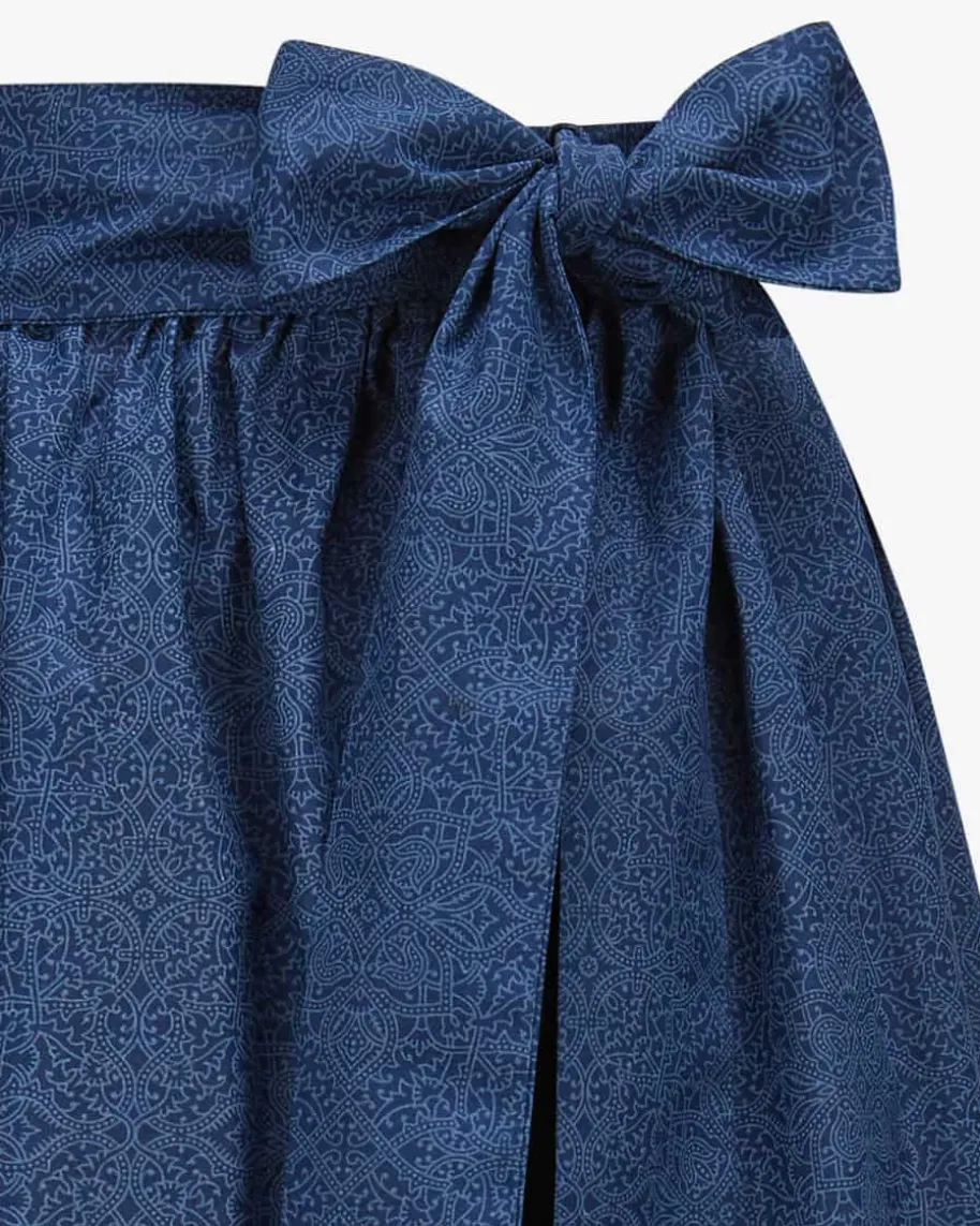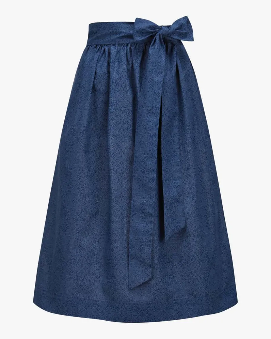 Schürze für Damen von LODENFREY in Dunkelblau. Das Modell präsentiert sich mitleichter Baumwoll-Qualität und feinem Ornament-Muster – Ein femininer Begleiterfür vielseitige Trachten-Looks.
