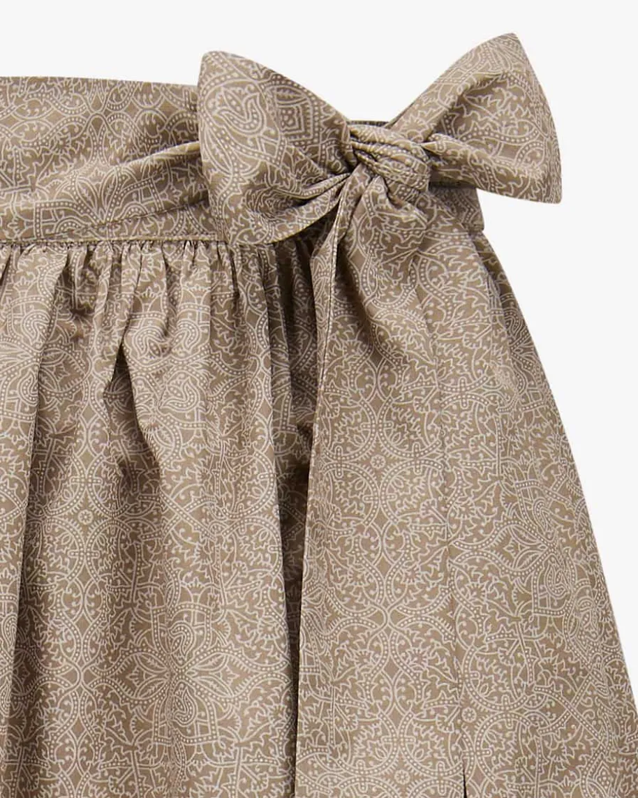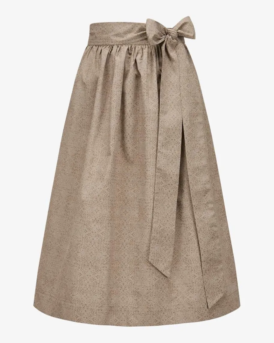 Schürze für Damen von LODENFREY in Taupe. Das Modell präsentiert sich mitleichter Baumwoll-Qualität und feinem Ornament-Muster – Ein femininer Begleiterfür vielseitige Trachten-Looks.