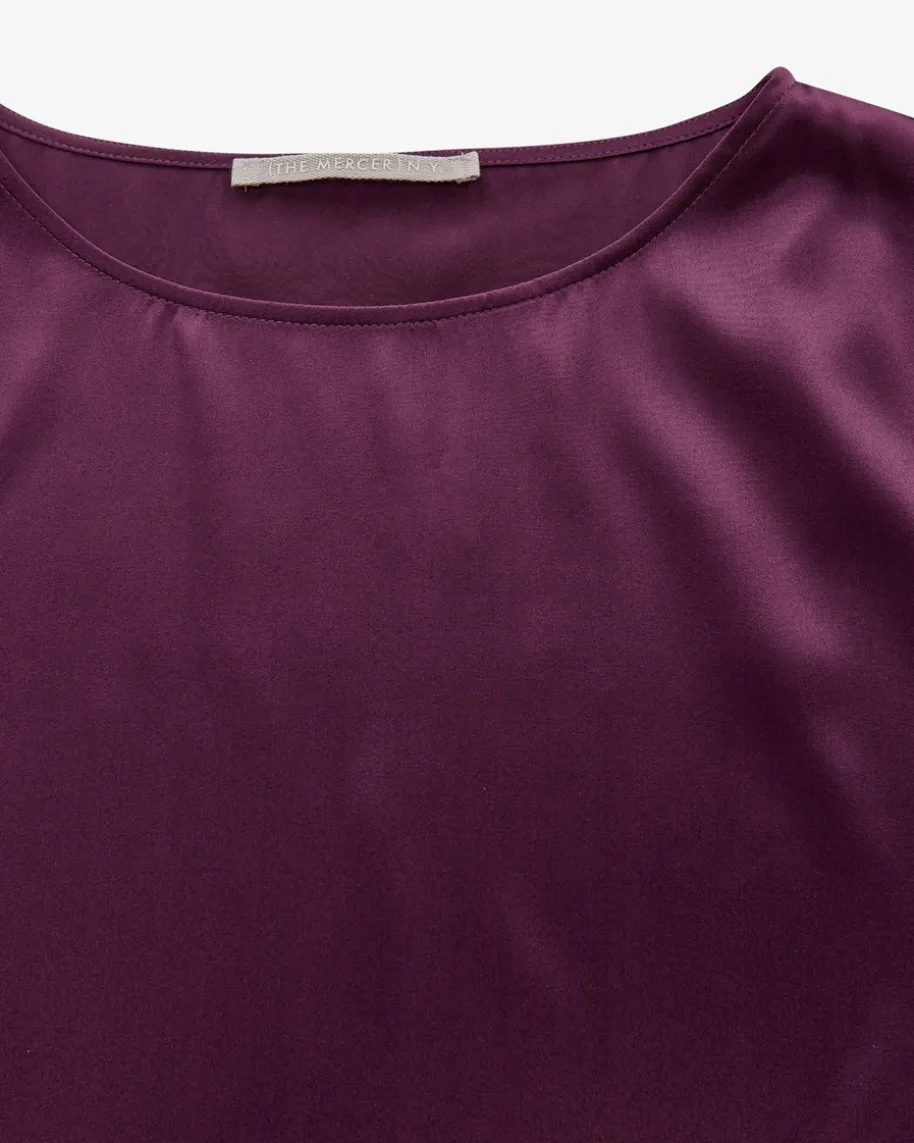 Seiden-Blusenshirt für Damen von (The Mercer) N.Y. in Aubergine. Das weitgeschnittene Modell zeichnet sich besonders durch die elastische Seiden-Qualitätaus, die nicht nur ein edel changierendes Finish verleiht, sondern auch mitangenehmer Haptik punktet.