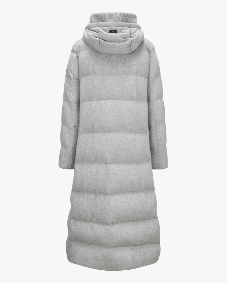 Seiden-Cashmere-Daunenmantel für Damen von Herno in Hellgrau. Das italienischePremium Label ist seit Jahren bekannt für seine besonders leichten Daunenjacken,die mit zeitlos-sportiven Designs überzeugen. Auch dieses verlängerte Modellbegeistert mit weicher Stepp-Optik sowie hochwertiger Daunen-Feder-Füllung, diefür angenehm-warme Tragemomente sorgt.