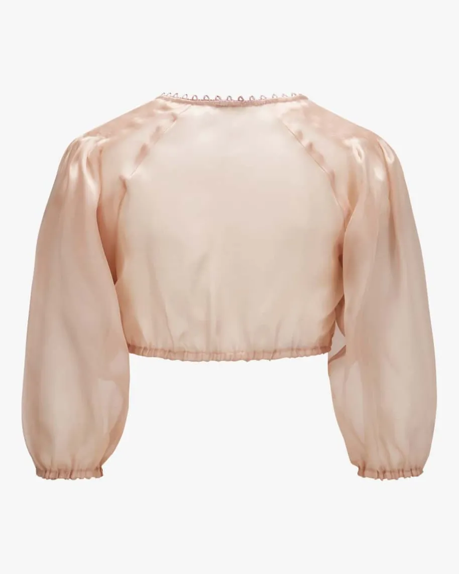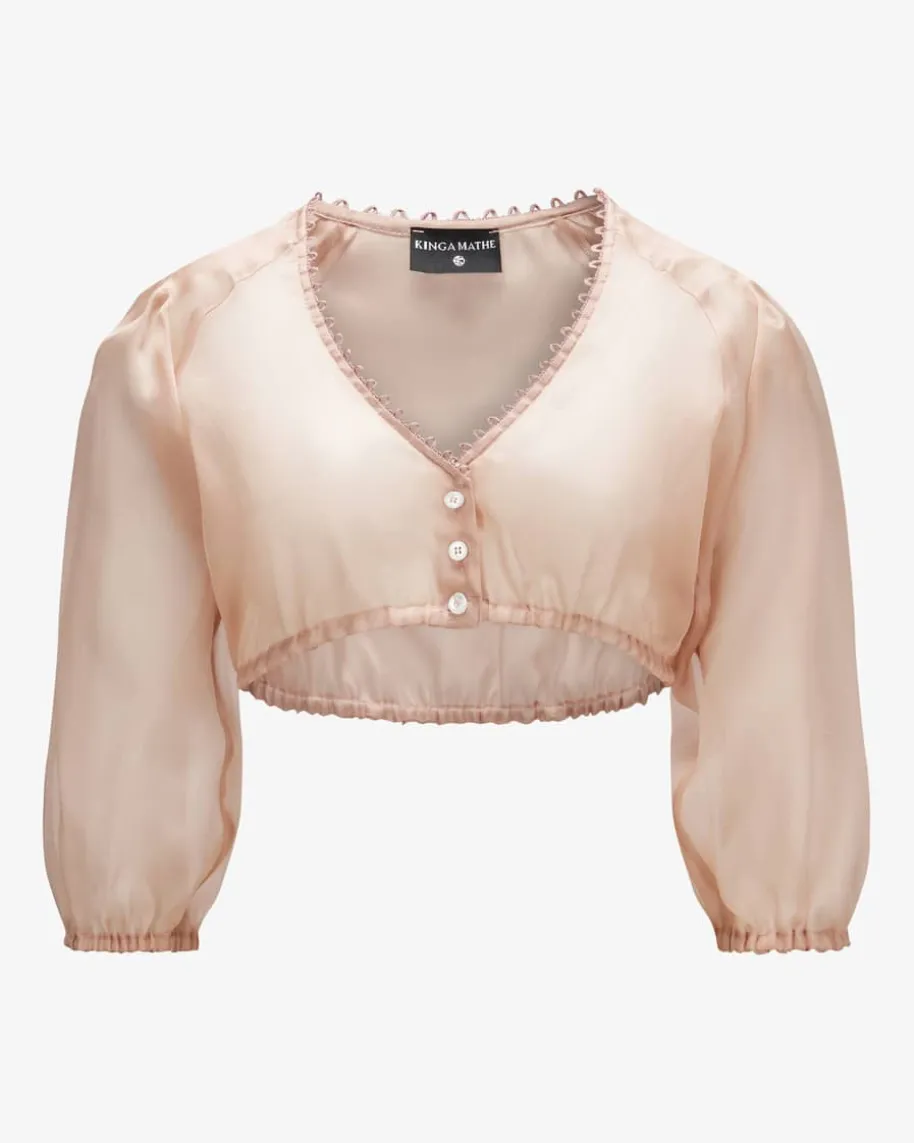 Seiden-Dirndlbluse für Damen von Kinga Mathe in Rosé. Das semitransparenteModell avanciert dank der abgenähten Falten-Details an der Schulter zummodischen Blickfang, während die Ballonärmel den femininen Look gekonnt in Szenesetzen.