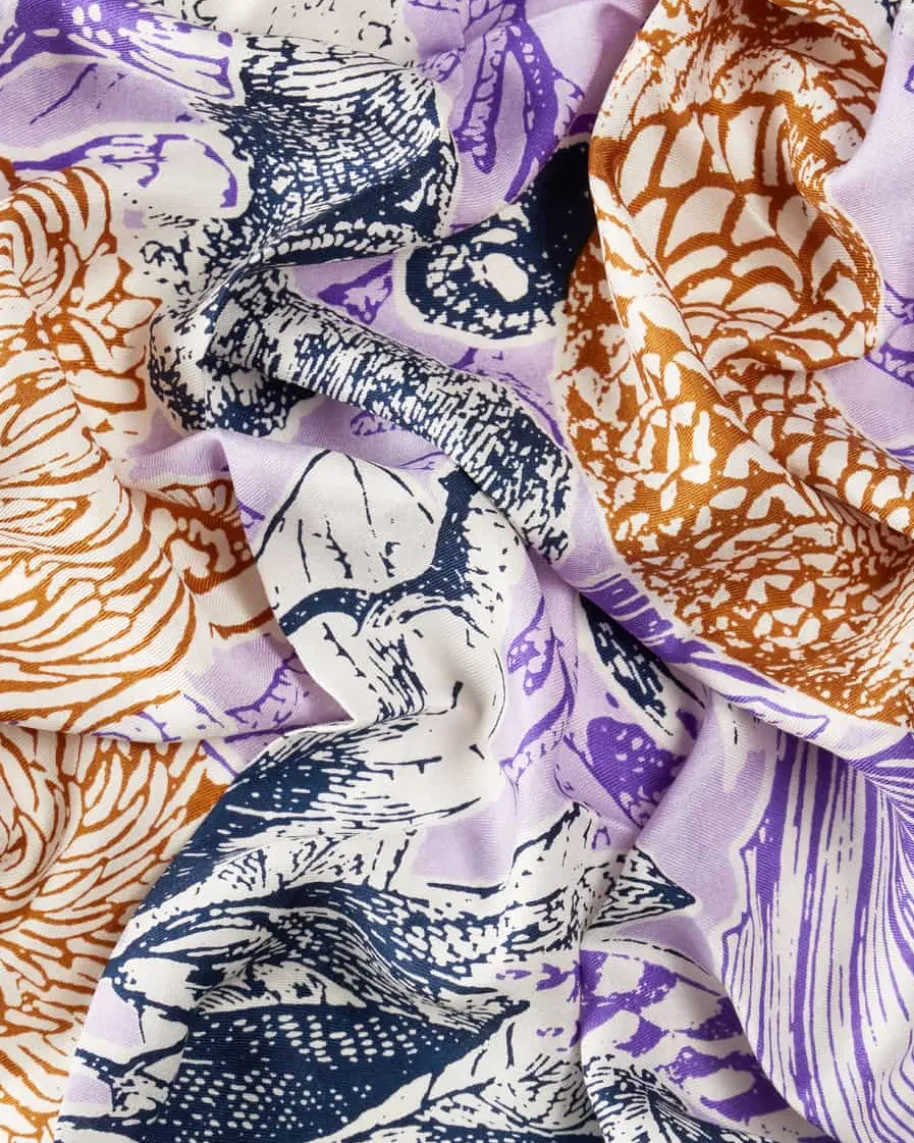 Seiden-Tuch für Damen von Friendly Hunting in Violett, Creme und Ocker. Das 2005gegründete Cashmere-Unternehmen Friendly Hunting setzt auf modischeSchnittführung und außergewöhnliche Verarbeitung. Dieses Modell besticht durchdie feine Seiden-Qualität, während das modische Allover-Dessin ein stilvollesAccessoire kreiert.