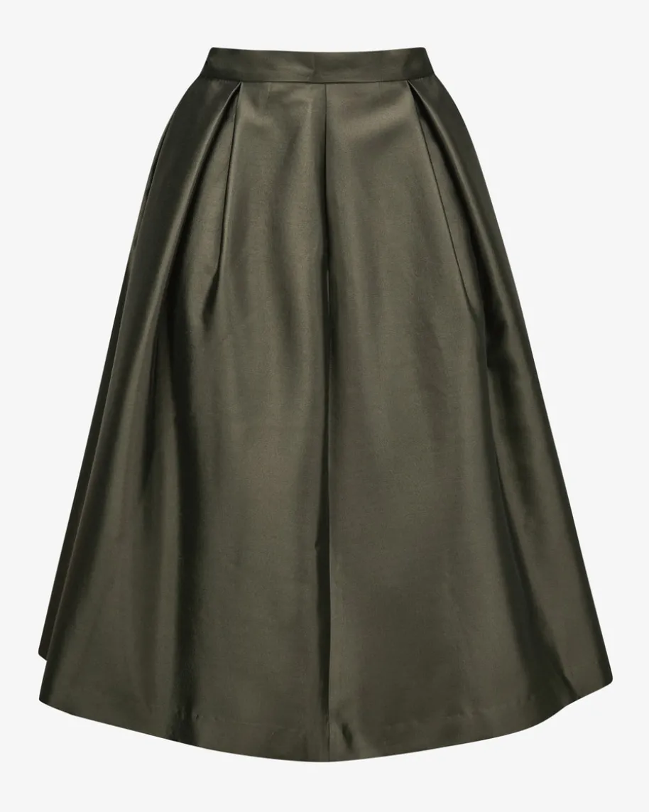 Seiden-Wollrock für Damen von The Loom in Dunkeloliv. Das ausgestellte Modellpunktet dank der hochwertigen Verarbeitung aus Seide und Wolle in edlerAufmachung, während die Falten-Details den modischen sowie femininen Lookbetonen.