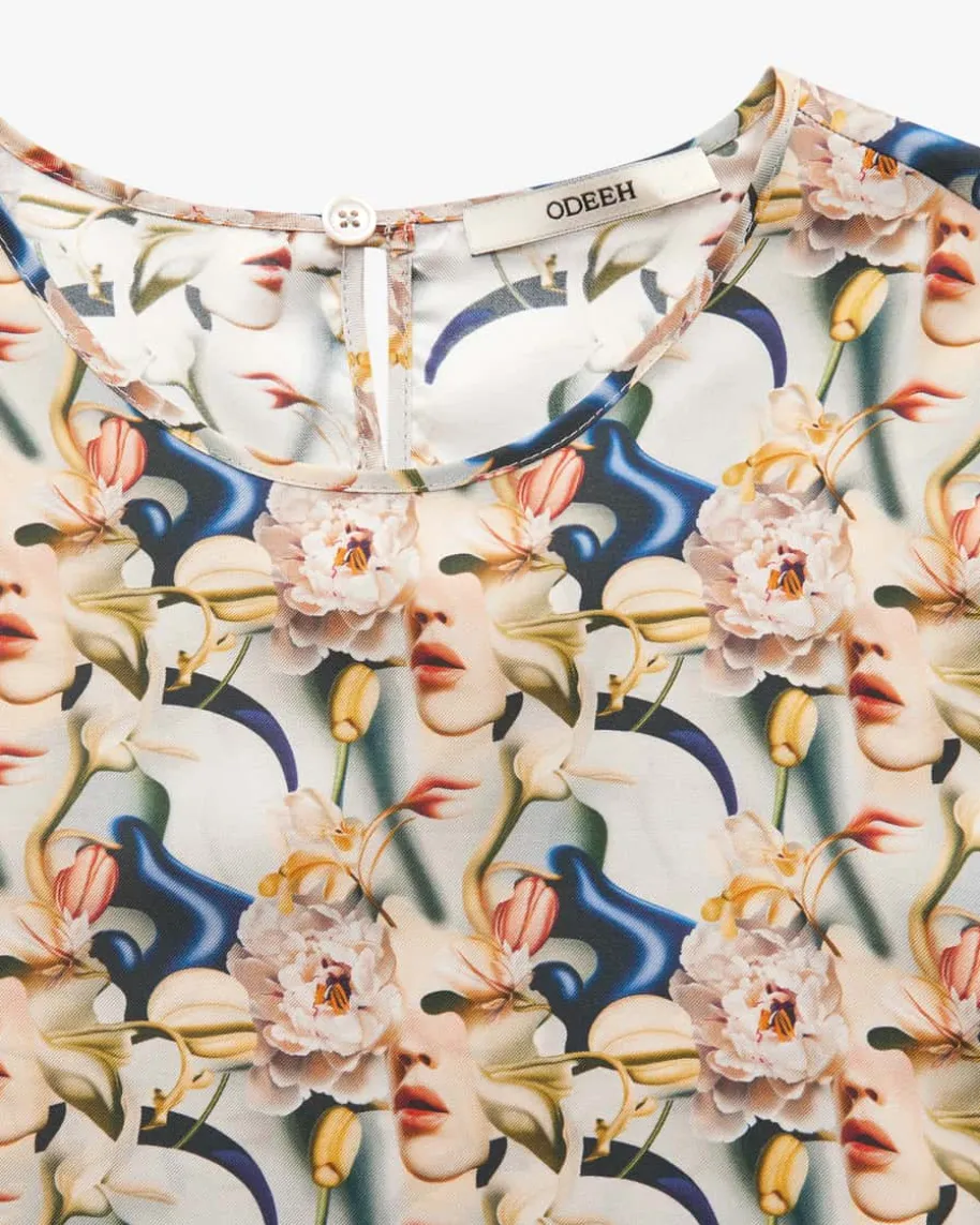 Seidenbluse für Damen von Odeeh in Bunt. Dank der fließenden Seiden-Qualitätpunktet das leicht ausgestellte Modell mit einer angenehmen, luxuriösen Haptik,während der surrealistische Print einen stilvollen Hingucker-Look kreiert.