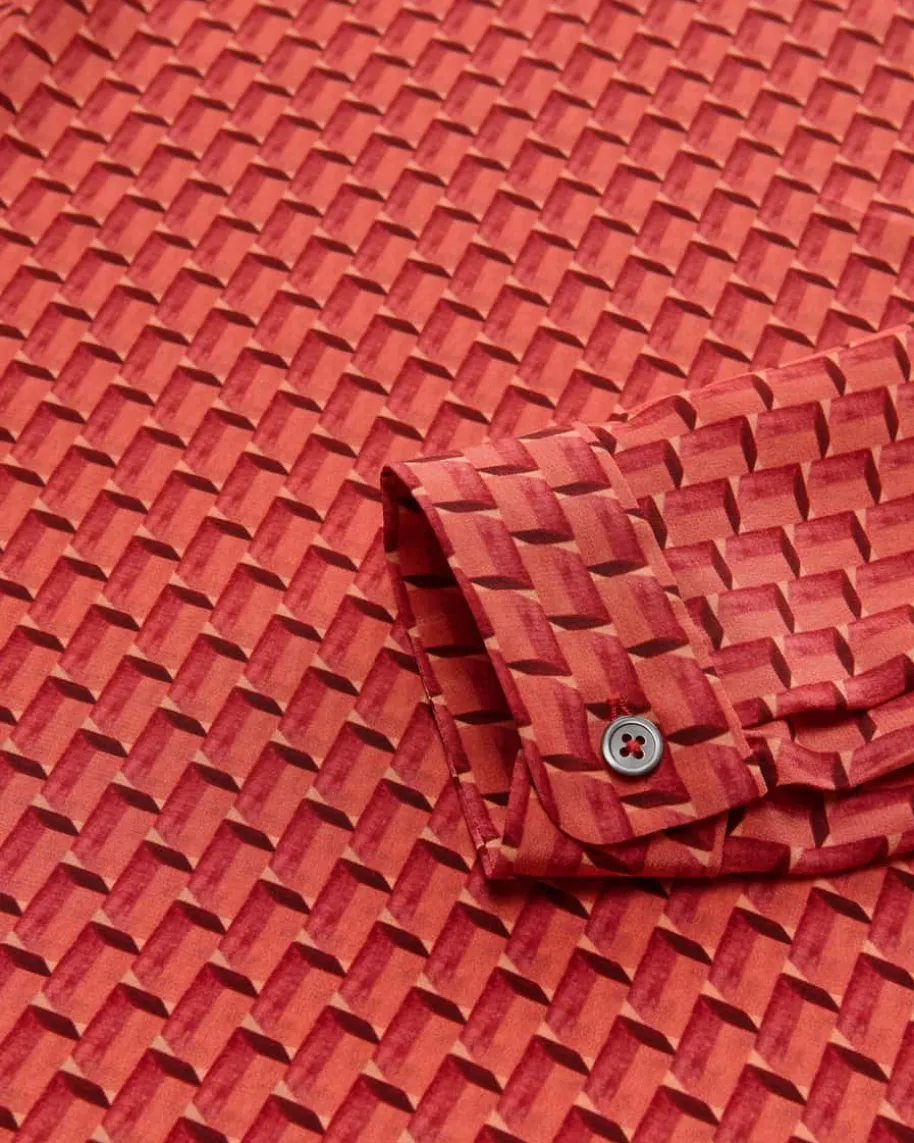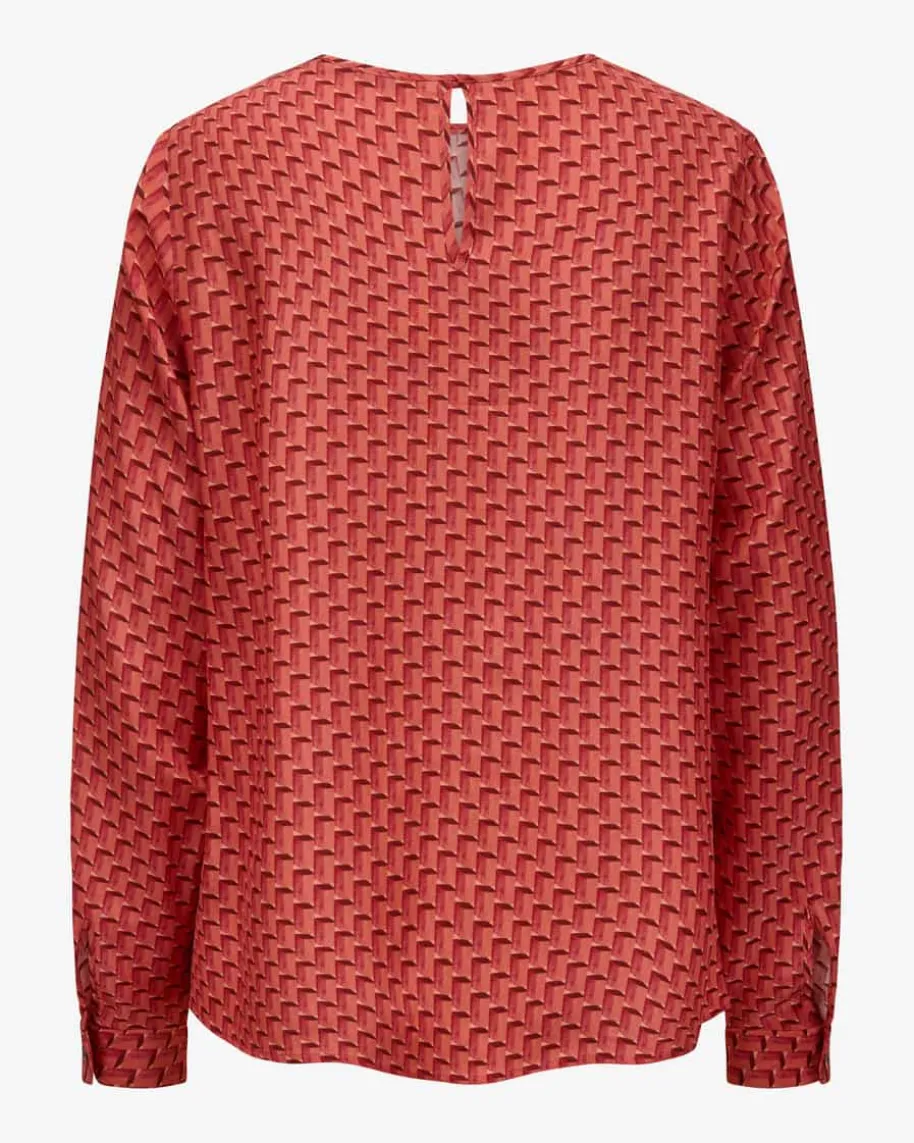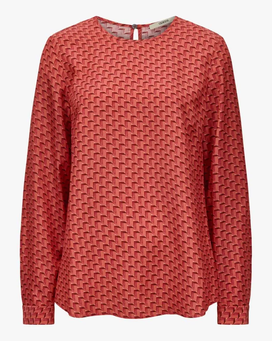 Seidenbluse für Damen von Odeeh in Koralle, Lachs und Bordeaux. Dank derfließenden Seiden-Qualität punktet das ausgestellte Modell mit einer angenehmen,luxuriösen Haptik, während das geometrische Muster in 3D-Optik ein stilvollesGesamtbild kreiert.
