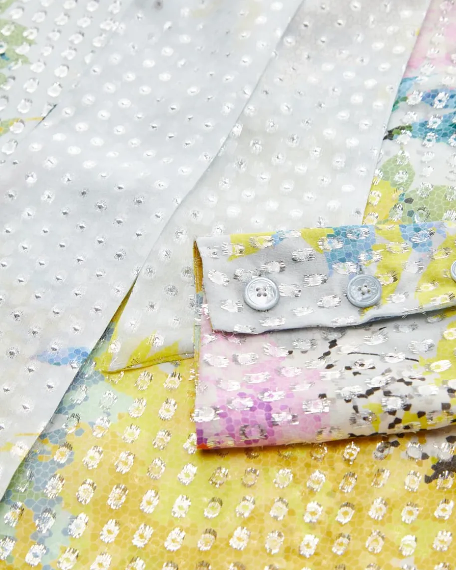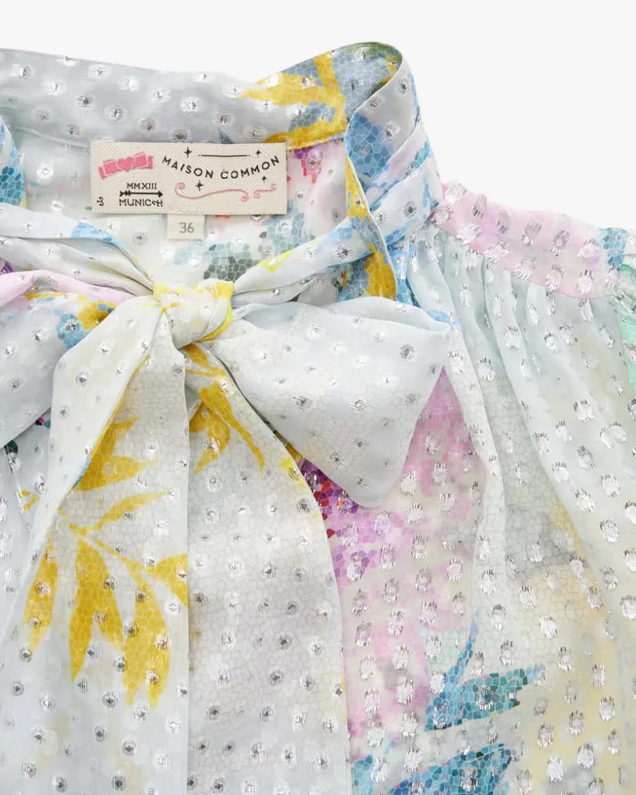 Seidenbluse für Damen von Maison Common in Bunt und Silber. Das Label verkörpertLebensfreude und Esprit, die sich neben femininem Charme mit farbenfrohenDesigns sowie Mustern in den Kollektionen wiederfinden. Auch dieses Modellbegeistert dank hochwertigem Seiden-Mix in semi-transparenter Optik, während derraffinierte Schluppenkragen und das farbenfrohe Muster mit Glitzerfasern einenkreativen Hingucker-Style schafft.