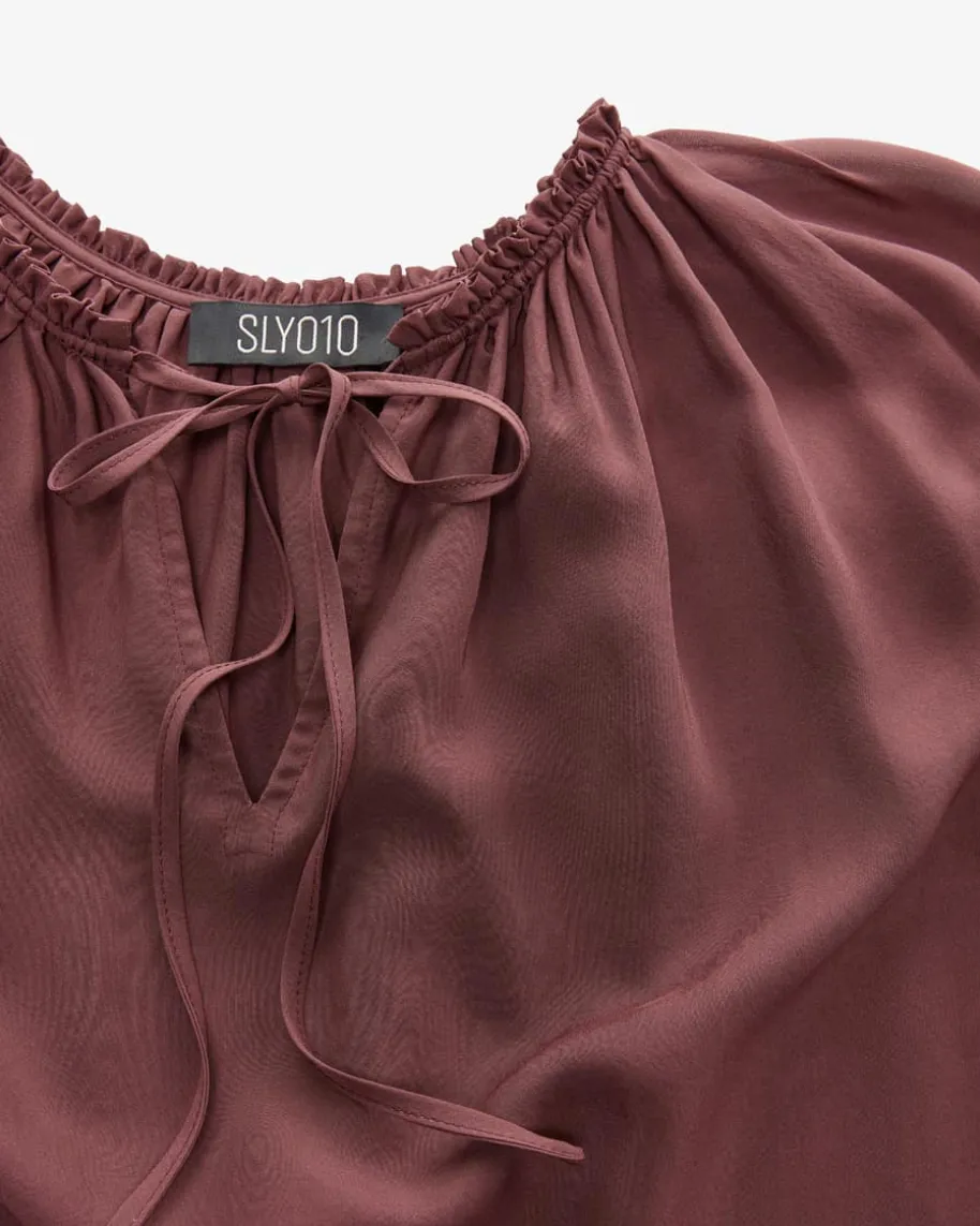Seidentunika für Damen von SLY010 in Bordeaux. Das Modell besticht inromantischer Aufmachung dank der legeren Tunika-Passform, während zarte Rüschen-Details und asymmetrische Volant-Ärmel den femininen Look betonen. Zudem rundetdie exklusive Seide das Gesamtbild harmonisch ab.