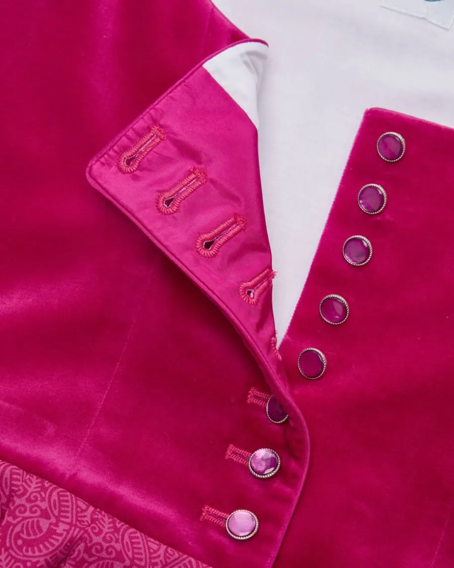 Susetta Midi-Dirndl mit Seidenschürze für Damen von Tostmann in Pink.Österreichische Traditionsmarke mit eigener Manufaktur – authentisch, zeitlos,hochwertig. Auch dieses Modell besticht mit Mieder in Samt-Aufmachung, währendder Rock in abstraktem Dessin und die changierende Seidenschürze dentraditionellen Look gekonnt ergänzen.