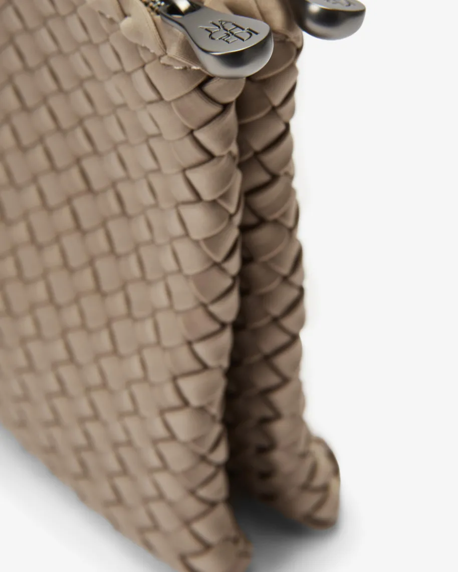 Soho Medium Messenger Umhängetasche für Damen von Naghedi in Beige. Diesestextile Modell präsentiert sich in dezent changierender Optik und edler Flecht-Aufmachung, während das doppellagige Design mit zwei gleichen, flachenReißverschluss-Taschen einen raffinierten wie auch praktischen Begleiterkreiert.