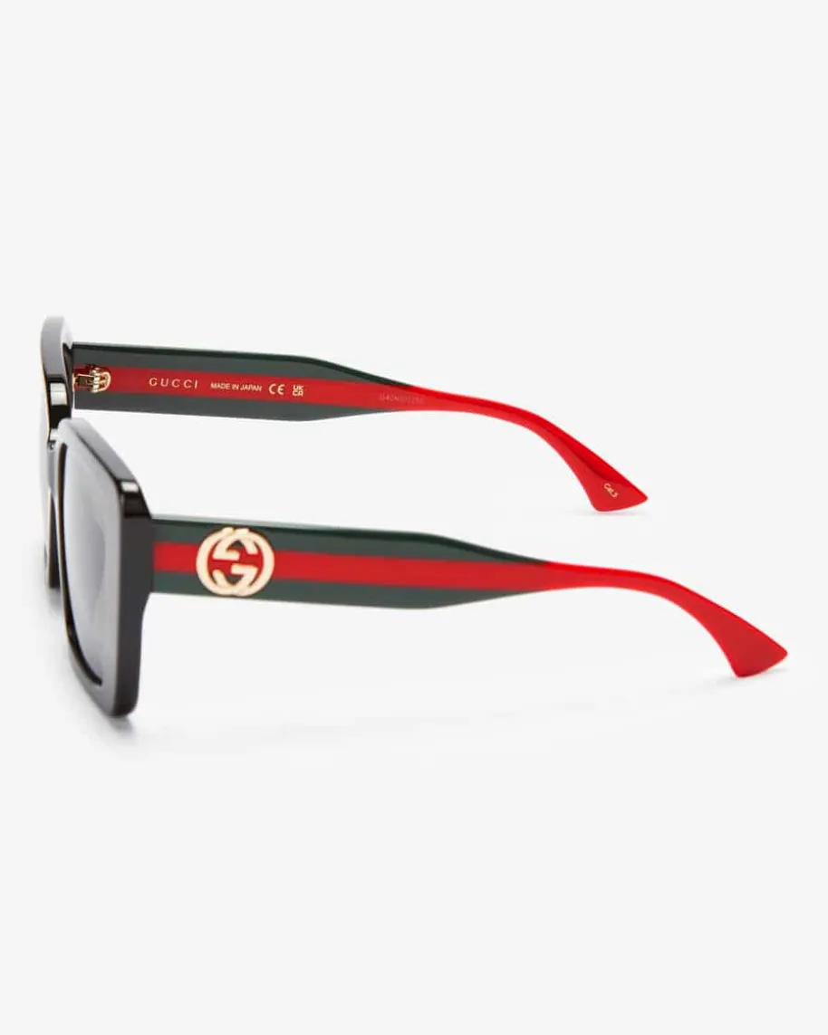 Sonnenbrille für Damen von Gucci Eyewear in Schwarz, Rot und Grün. DasAccessoire verleiht jedem Look dank dem markanten Rahmen in eckiger Form einenextravaganten Touch. Die goldfarbenen Logo-Details am Bügel sowie diecharakteristischen Gucci-Streifen runden das Modell gekonnt ab.