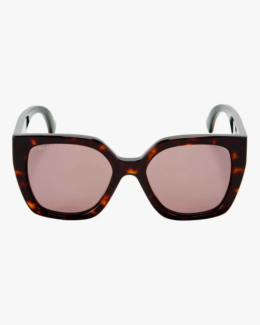 Sonnenbrille für Damen von Gucci Eyewear in Braun, Grün und Bordeaux. Diesesgroße Modell avanciert dank dem eckigen Rahmen sowie der Horn-Optik zummodischen Begleiter für sommerliche Tage. Zugleich runden die goldfarbenen Logo-Applikationen sowie das charakteristische Streifen-Dessin an den Bügeln den Lookgekonnt ab.