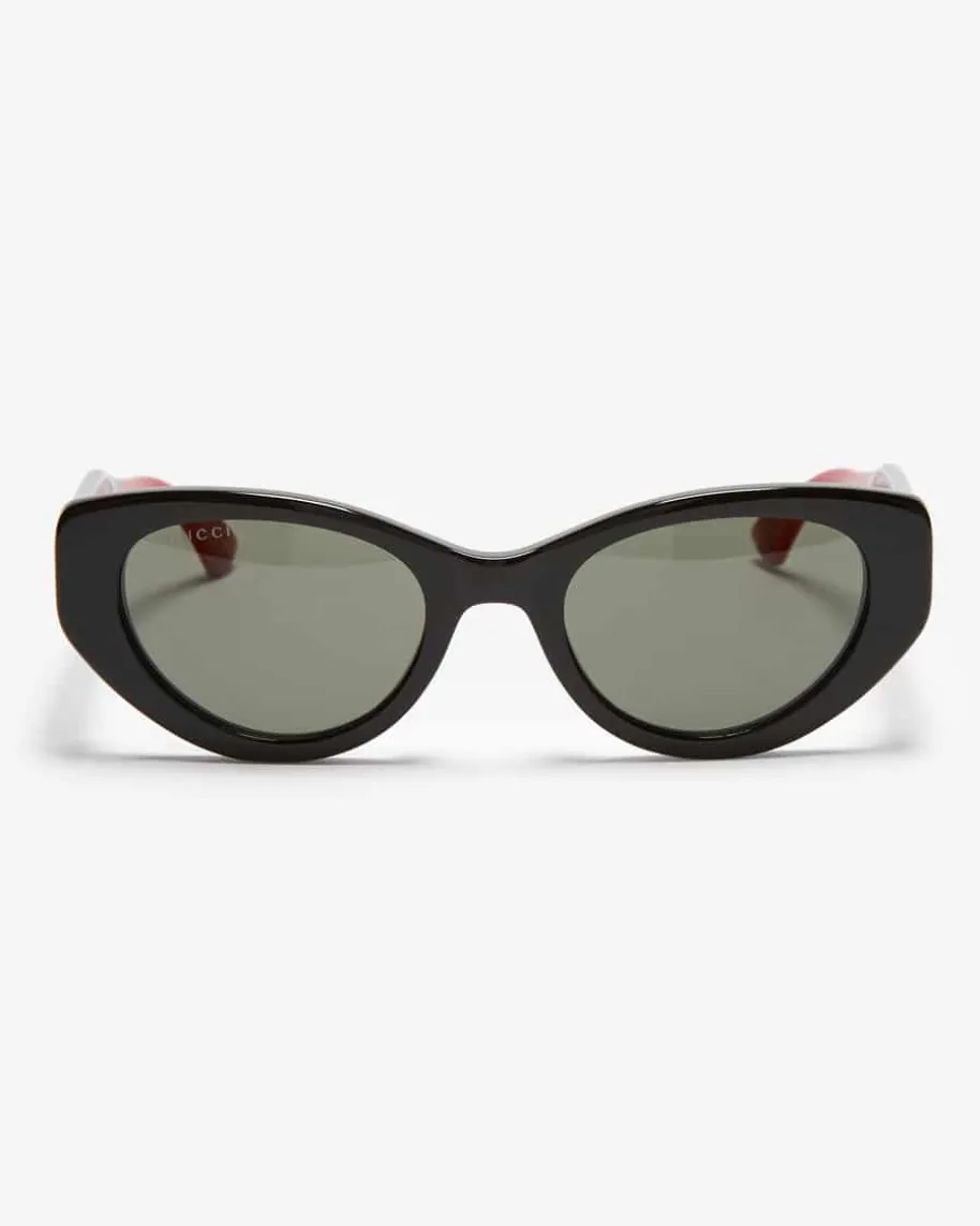 Sonnenbrille für Damen von Gucci Eyewear in Schwarz, Dunkelgrün und Rot. DasModell besticht dank der ikonischen Farbkombination in modischer Aufmachung,während die getönten Gläser sowie die goldenen Logo-Details ein sommerlichesAccessoire kreiert.
