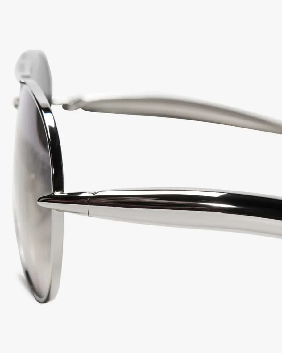 Sonnenbrille von Bottega Veneta Eyewear in Silber und Dunkelgrau. Das Modellpräsentiert sich dank der stilvoll-eleganten Aufmachung als modischer Begleiterfür sommerliche Looks, während die gefärbten Gläser in Piloten-Form den letztenSchliff verleihen.
