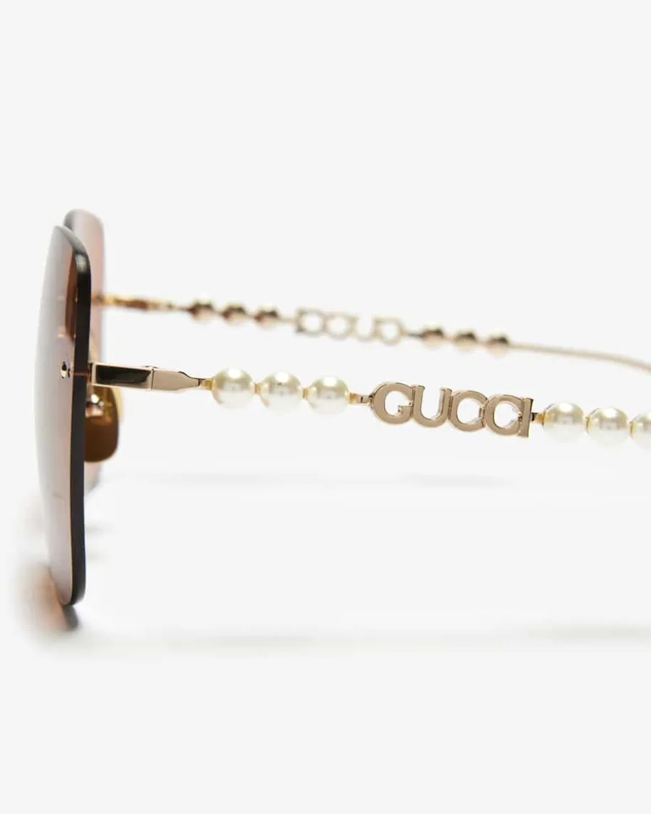 Sonnenbrille für Damen von Gucci Eyewear in Gold, Off-White und Bronze. Dank dergoldfarbenen Metall-Optik sowie der filigranen Bügel mit Schmucksteinen inPerlen-Aufmachung besticht das Modell in modischer Aufmachung, während dieextravaganten Gläser mit Tönung ein stilvolles Gesamtbild schaffen.
