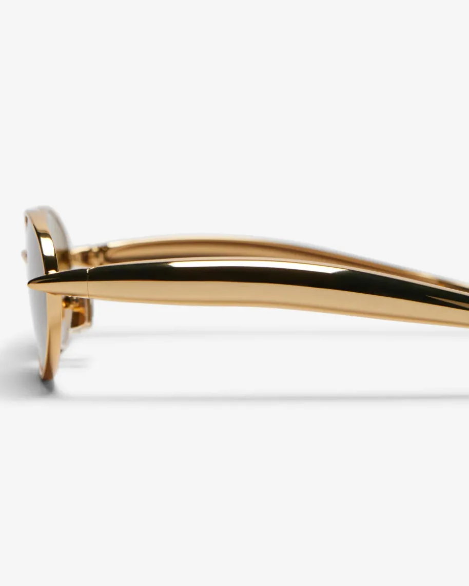 Sonnenbrille von Bottega Veneta Eyewear in Gold. Dank der ovalen Form sowie demschmalen Rahmen überzeugt das Modell als moderner Begleiter für sonnige Tage,während die markanten, breiten Bügel einen futuristischen Charakter verleihen.