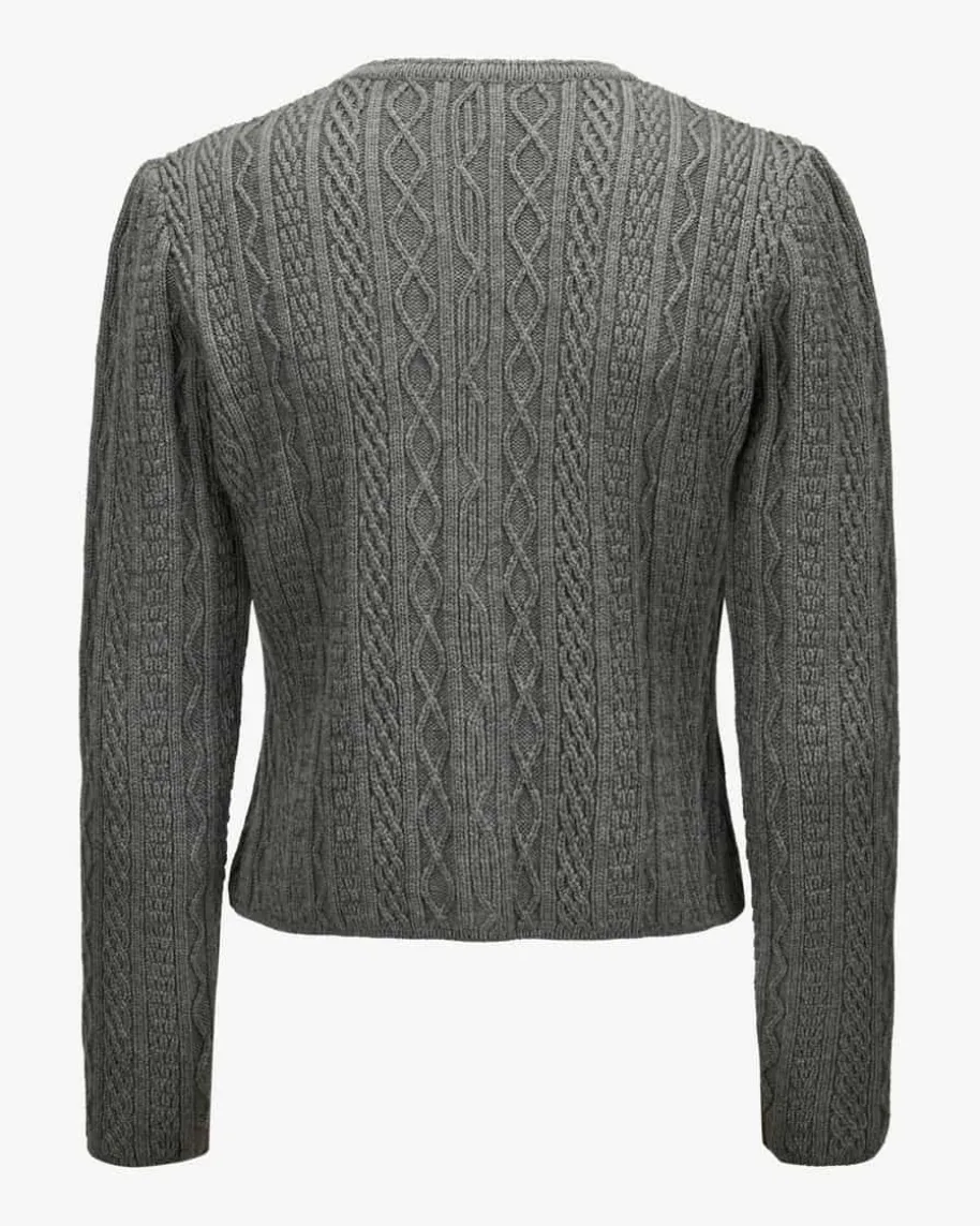 Sophia Trachten-Strickjacke für Damen von Gottseidank in Dunkelgrau. Diehochwertige Merinowolle mit feinen Zopfstrick-Muster punktet mit besondersangenehmem Tragekomfort, während stilvolle Kugelknöpfe sowie die Raffungen anden Schultern das traditionelle Modell gekonnt vollenden.