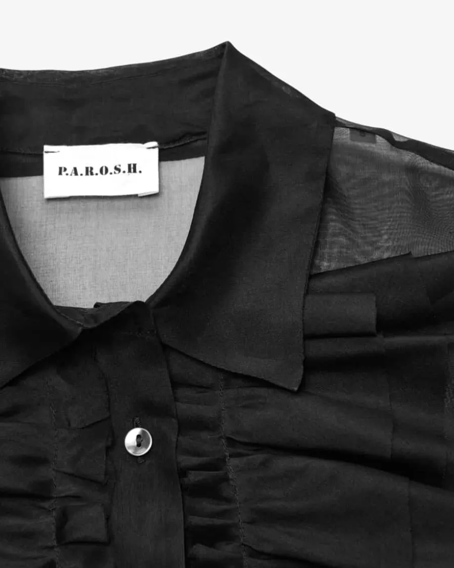 Sorgente25 Seidenbluse für Damen von Parosh in Schwarz. Die Marke steht fürverspielte Designs mit Vintage-Flair – farbenfrohe Prints, Glitzer und Retro-Vibes made in Italy. Das Modell überzeugt in transparenter Rüschen-Aufmachung,während die hochwertige Seiden-Qualität angenehme Tragemomente schafft, rundenklassische Details den Gesamtlook harmonisch ab.