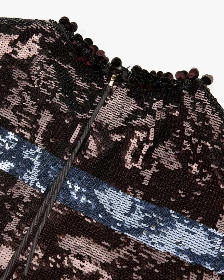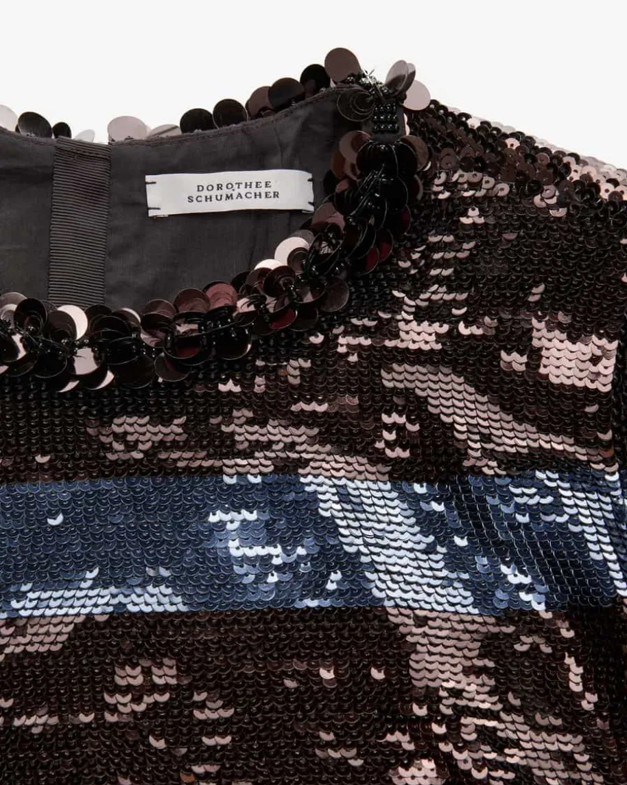 Sparkling Shine Kleid für Damen von Dorothee Schumacher in Dunkelbraun undBlaugrau. Mit kurzer, leicht ausgestellter Passform präsentiert sich diesesModell in modischer Pailletten-Aufmachung, die für einen raffiniert-changierenden Look sorgt. Abgerundet wird das Gesamtbild durch die markantenPailletten an Ausschnitt und Ärmelenden, während das dezente Streifen-Dessin denletzten Schliff verleiht.
