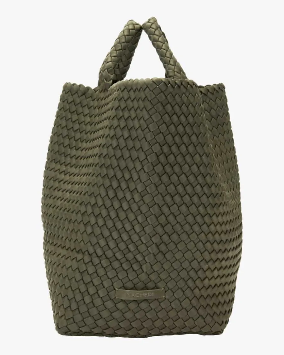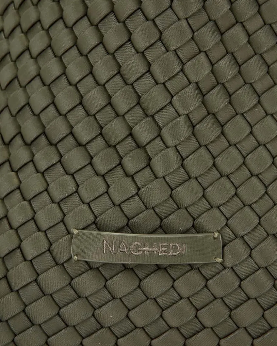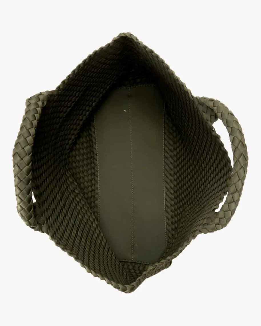 St. Barths Large Tote Handtasche für Damen von Naghedi in Dunkeloliv. Diesestextile Modell präsentiert sich in changierender Optik und edler Flecht-Aufmachung, während viel Stauraum geboten wird. Die separate Clutch ist miteinem Reißverschluss versehen und bietet Platz für Ihre Kosmetikartikel oderandere Kleinigkeiten.