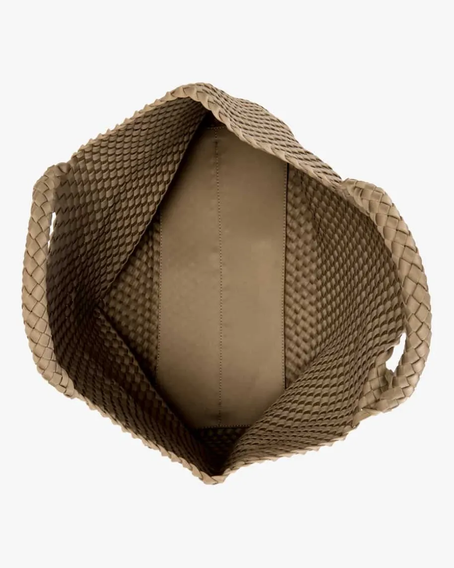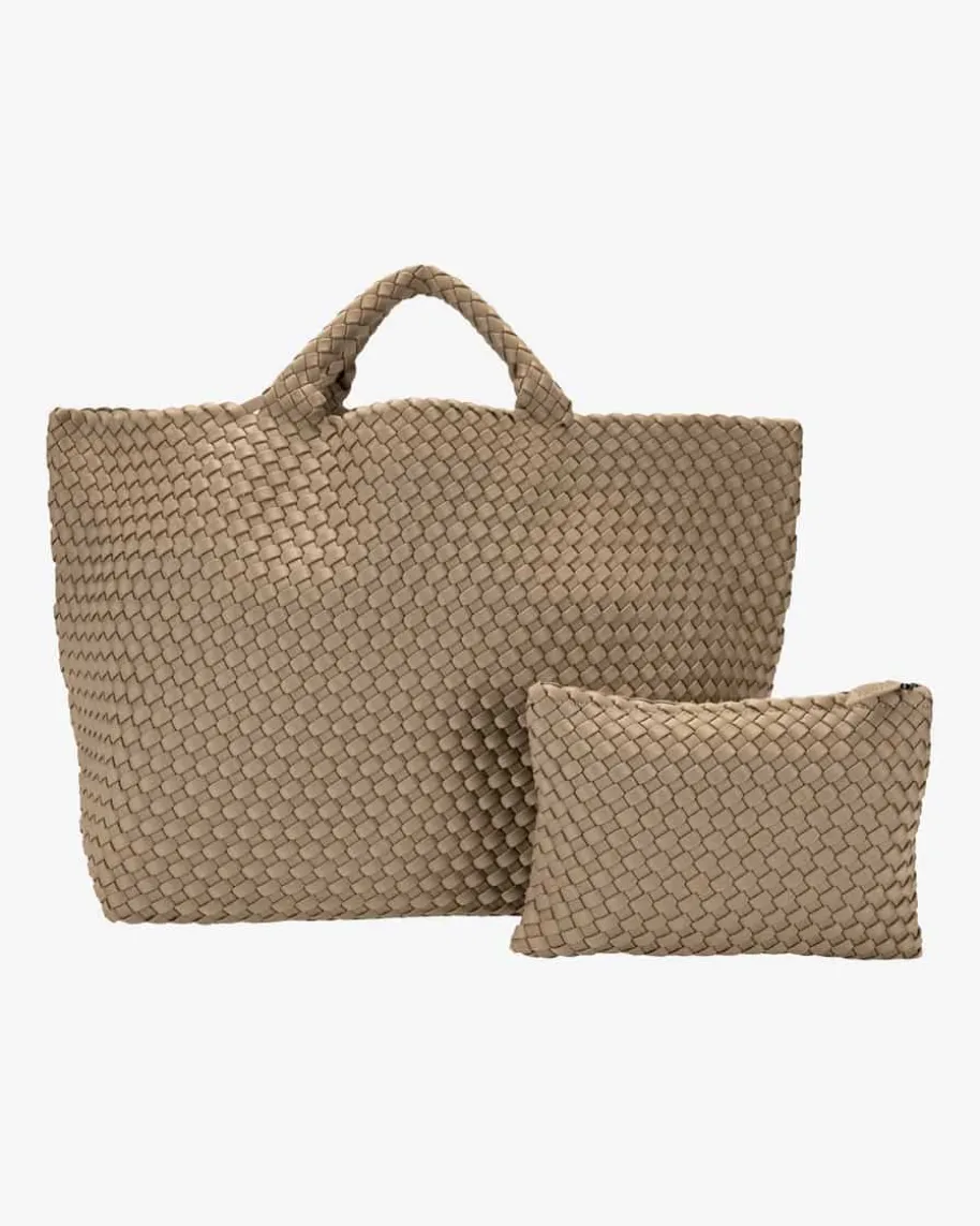 St. Barths Large Tote Handtasche für Damen von Naghedi in Taupe. Dieses textileModell präsentiert sich in changierender Optik und edler Flecht-Aufmachung,während viel Stauraum geboten wird. Die separate Clutch ist mit einemReißverschluss versehen und bietet Platz für Ihre Kosmetikartikel oder andereKleinigkeiten.
