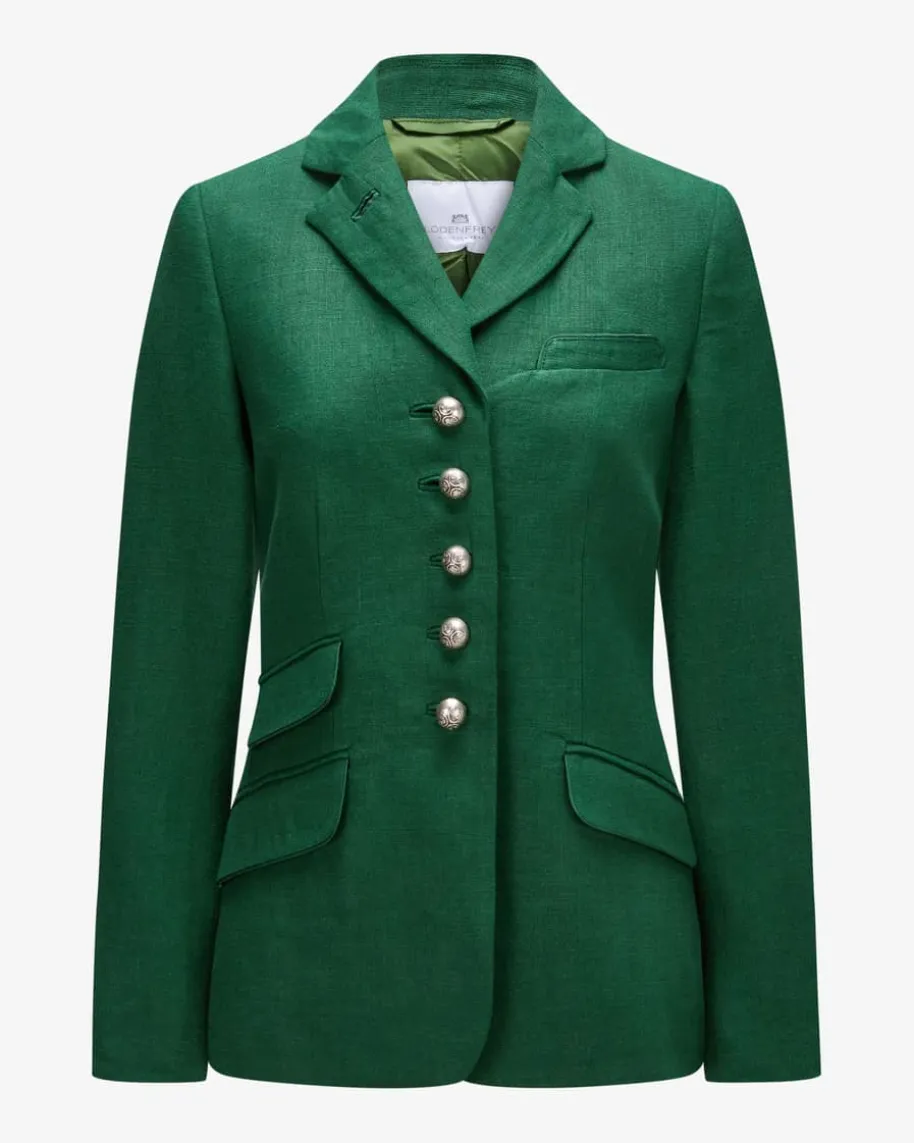 St. Gallen Trachten-Leinenblazer für Damen von LODENFREY München 1842 inDunkelgrün. Tradition und Moderne in perfektem Zusammenspiel – Das taillierteModell aus reiner Leinen-Qualität präsentiert sich in fein strukturierter Haptikund hochwertiger Optik, während die silberfarbenen Kugelknöpfe sowie die tonigenPaspelierungen einen feminin-traditionellen Begleiter schaffen.