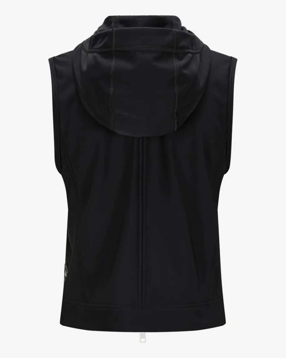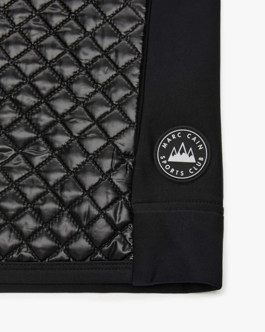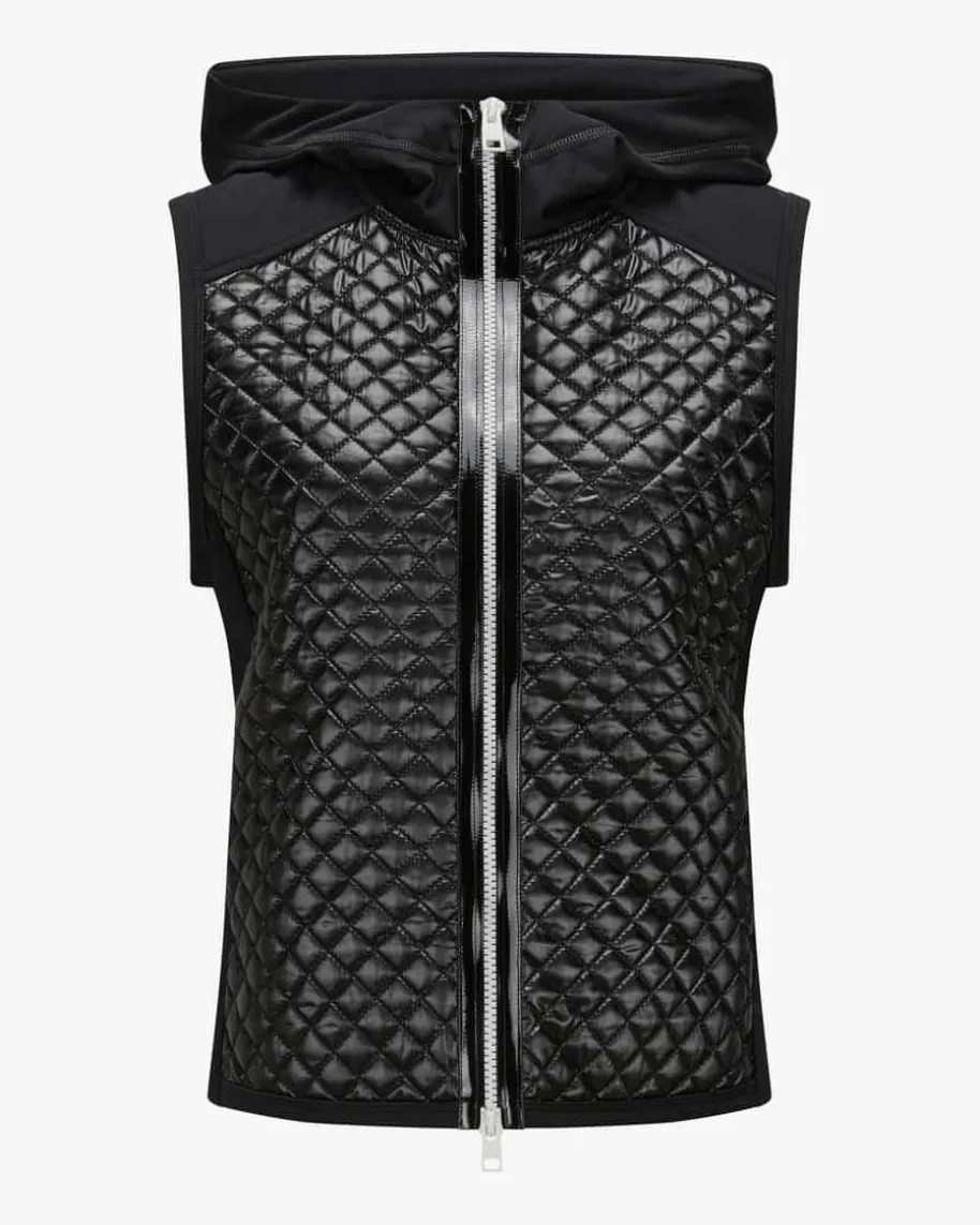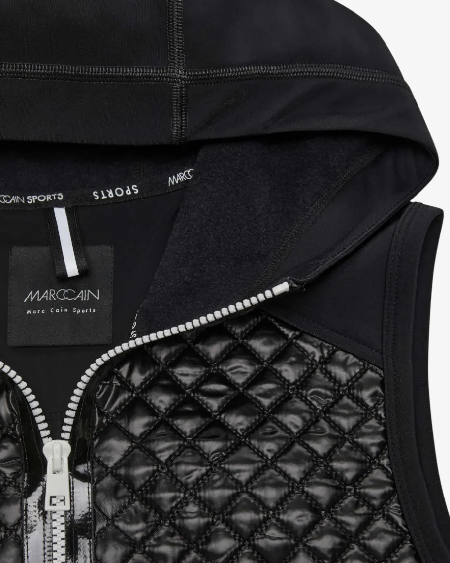 Steppweste für Damen von Marc Cain in Schwarz. Die deutsche Markesteht für selbstbewusste, feminine Looks. Auch dieses Modell präsentiert sichmit stilvollem Materialmix und gesteppten Partien, die den sportiven Charakterunterstreichen. Die Kapuze in Kombination mit dem markanten Reißverschlussrundet den legeren Look mit winterlichem Touch gekonnt ab.