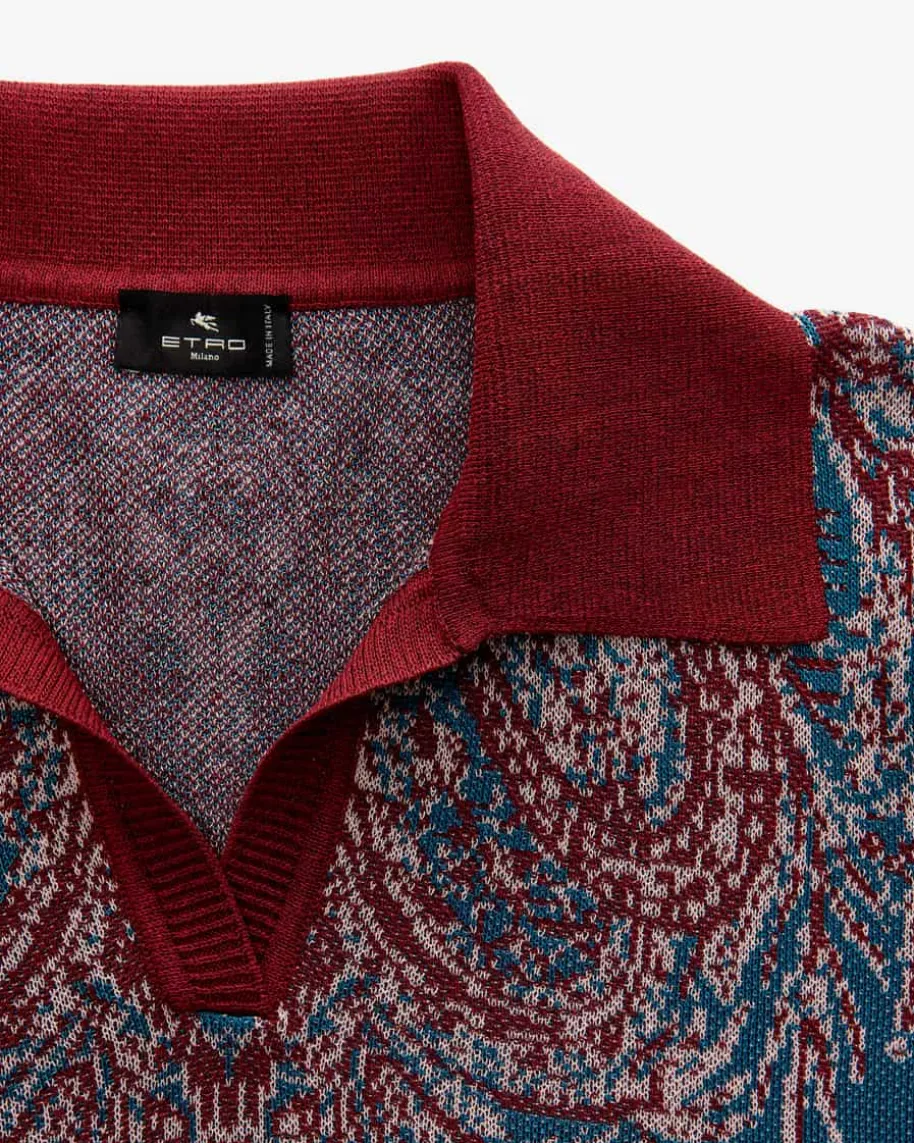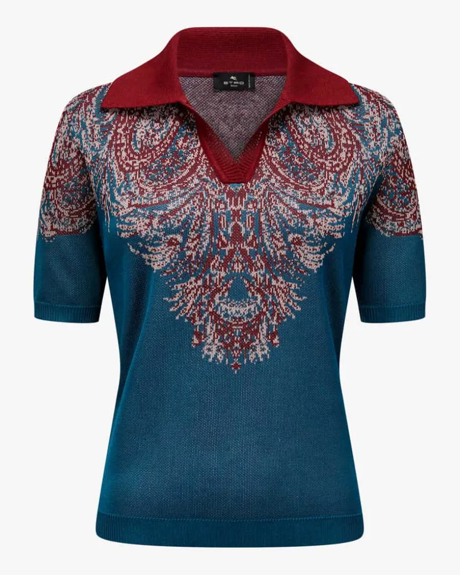 Strick-Poloshirt für Damen von Etro in Petrol, Bordeaux und Altrosa. Dank desfloralen Allover-Dessins besticht das Modell in stilvoller Aufmachung, währenddie elastische Material-Qualität ein angenehmes Tragegefühl verspricht.