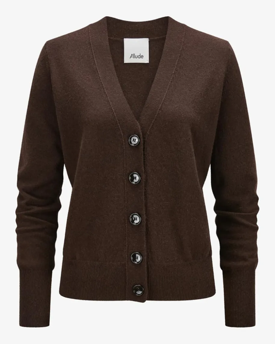 Strickjacke für Damen von Allude in Schokolade. Das Münchner Label wurde 1993von Andrea Karg gegründet und ist bekannt für luxuriöse Strickmode aus edlemCashmere. Auch dieses Feinstrick-Modell überzeugt mit hochwertigem Schurwolle-Cashmere-Mix, der für angenehmen Tragekomfort sorgt. Modische Inside-Out-Nähterunden den ansonsten cleanen Basic-Style harmonisch ab.