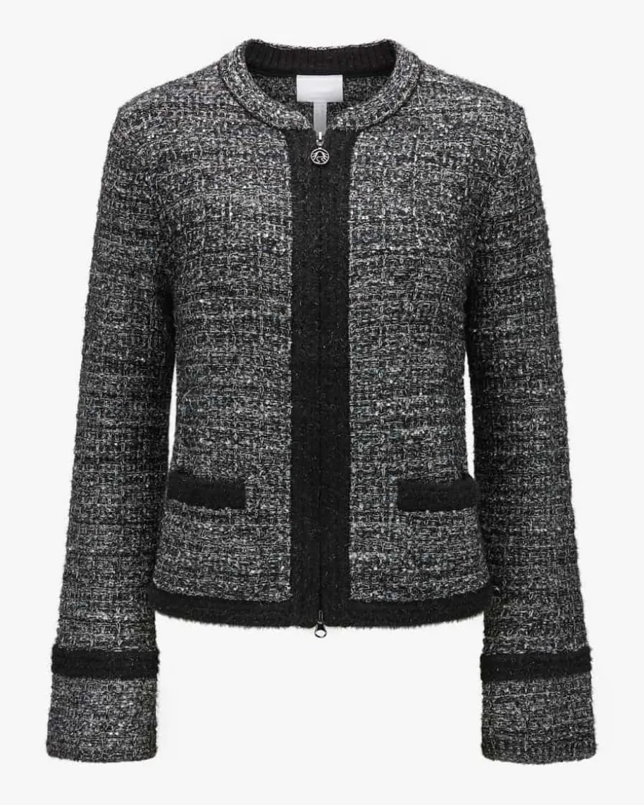 Strickjacke für Damen von Sportalm Emotion in Schwarz, Weiß und Blau. Das Modellbegeistert mit elastischer Material-Qualität im Tweed-Design, wodurch ein hoherTragekomfort und eine Blazer-Optik entstehen. Feine Lurex-Fasern setzen zugleichchangierende Akzente. Für einen feminin-eleganten Gesamt-Look kombinieren Sieden passenden Rock.