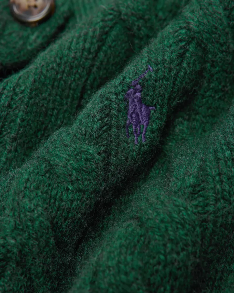 Strickjacke für Damen von Polo Ralph Lauren in Flaschengrün. Qualität,Lifestyle,Authentizität und zeitlose Eleganz – all das zeichnet die Marke Polo RalphLauren seit nunmehr 50 Jahren Firmengeschichte aus. Das Modell begeistert durchden besonders weichen Wolle-Cashmere-Mix mit hohem Tragekomfort. Stilvollabgerundet wird das Design durch die kontrastierende Logo-Stickerei auf derBrust sowie das klassische Zopf-Strickmuster.