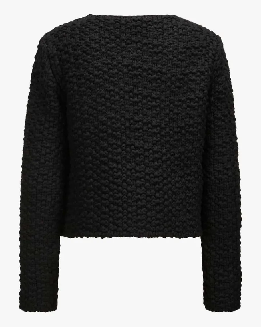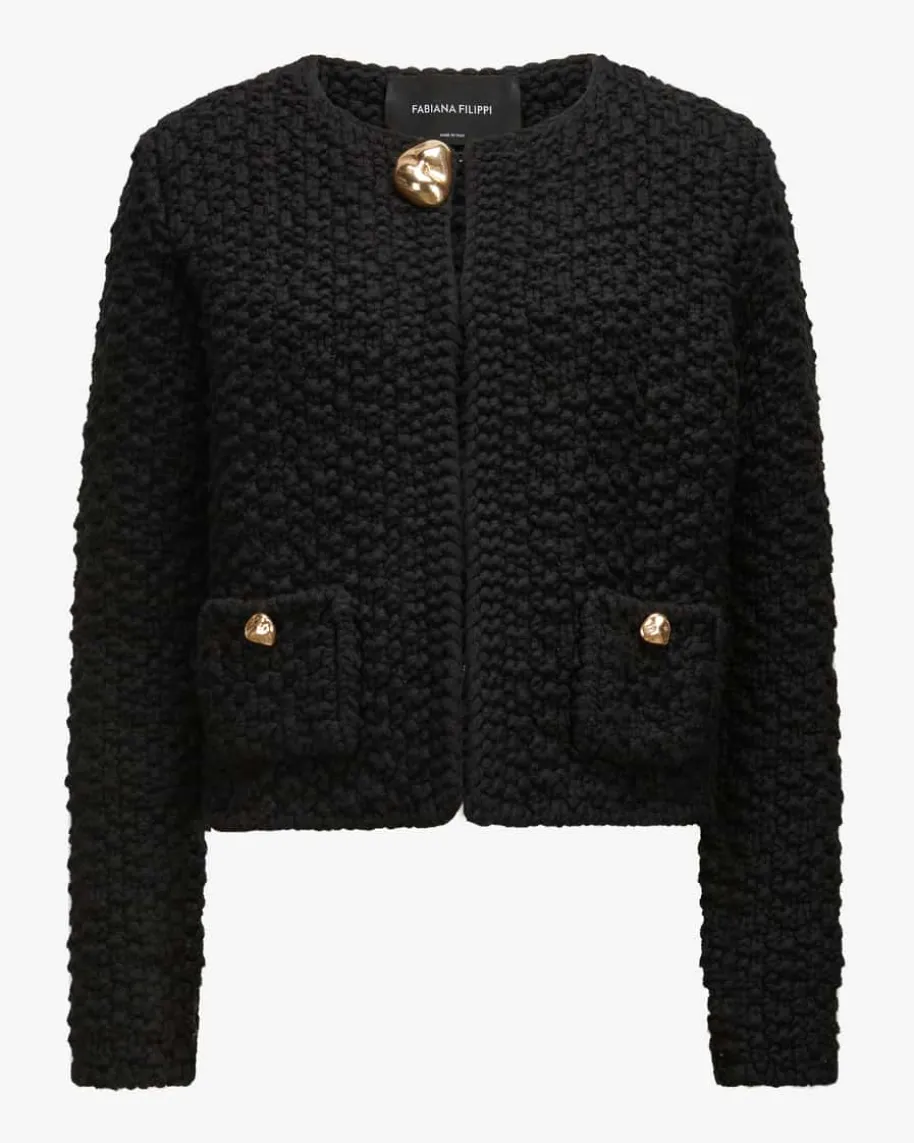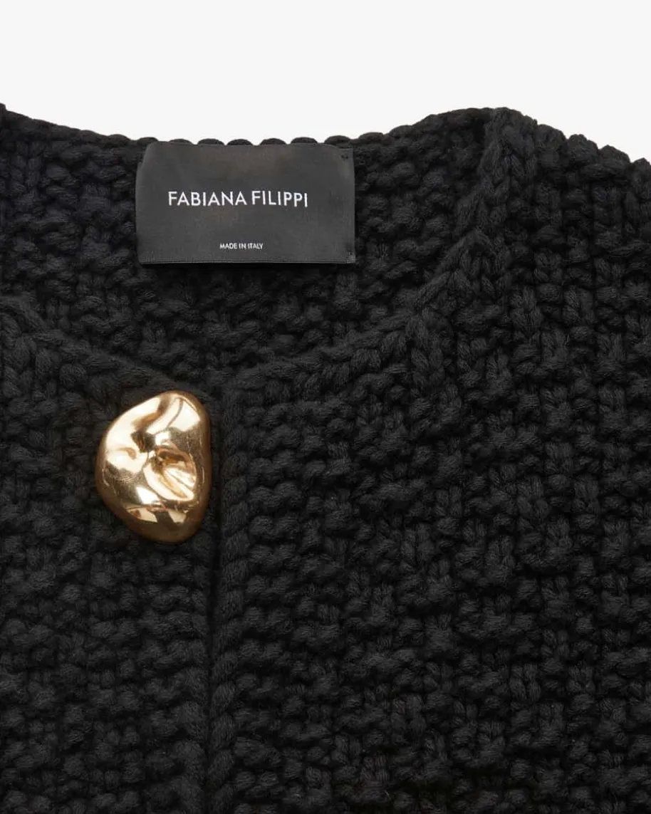 Strickjacke für Damen von Fabiana Filippi in Schwarz. Die italienische Markesteht für moderne Eleganz, hochwertige Materialien und dezente Farbwelten. DasGrobstrick-Modell überzeugt sowohl haptisch als auch optisch mit schweremMerinowolle-Mix, während die markanten goldfarbenen Knöpfe einen eleganten Lookschaffen.
