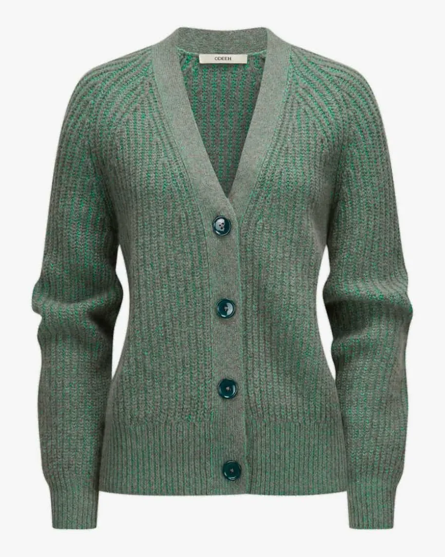 Strickjacke für Damen von Odeeh in Grün und Grau. Das Modell präsentiert sichmit weiter Silhouette und modernem Bicolor Rippstrick-Design, welches durch denhochwertigen Schurwoll-Cashmere-Mix mit weichem Griff überzeugt.