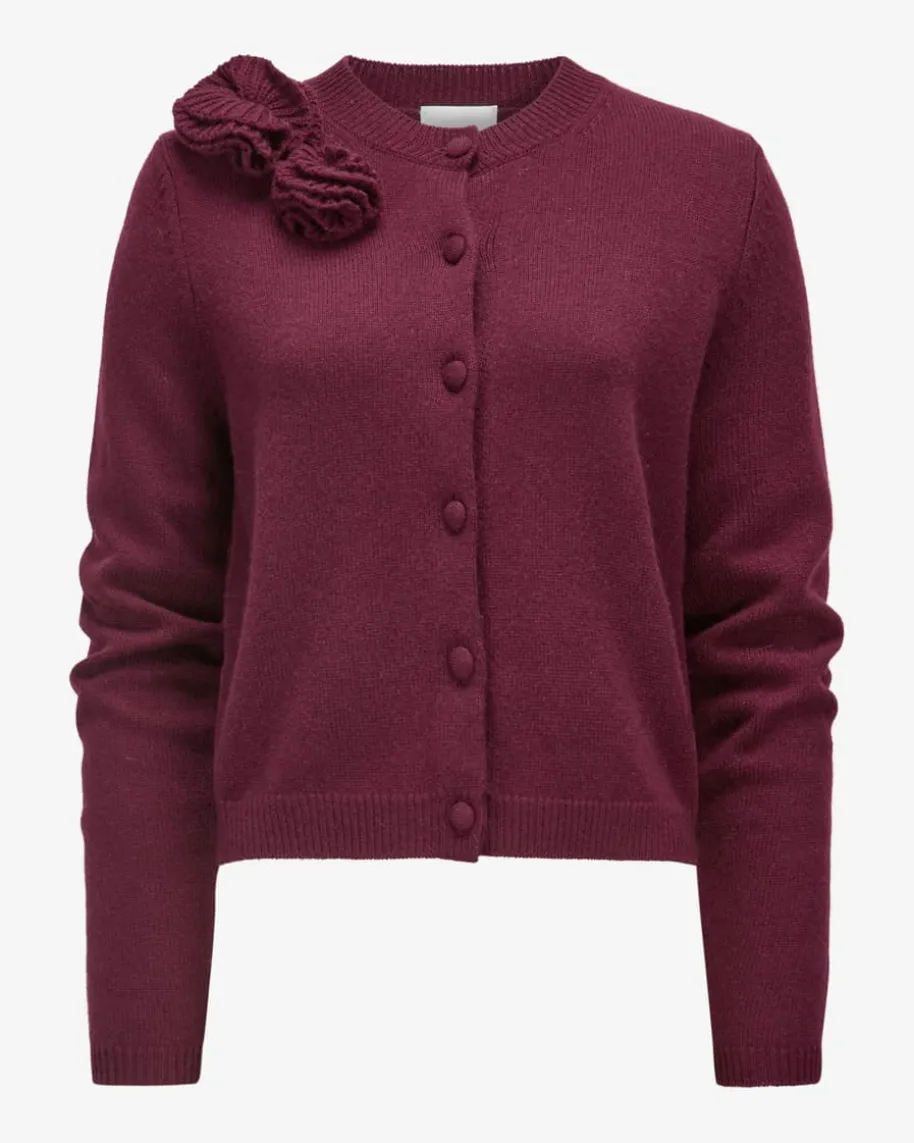 Strickjacke für Damen von Allude in Bordeaux. Das Münchner Label wurde 1993 vonAndrea Karg gegründet und ist bekannt für luxuriöse Strickmode aus edlemCashmere. Auch dieses Modell überzeugt mit edlem Schurwoll-Cashmere-Mix infeiner Strick-Aufmachung, während die applizierten Strickrosen den femininenLook romantisch ergänzen.