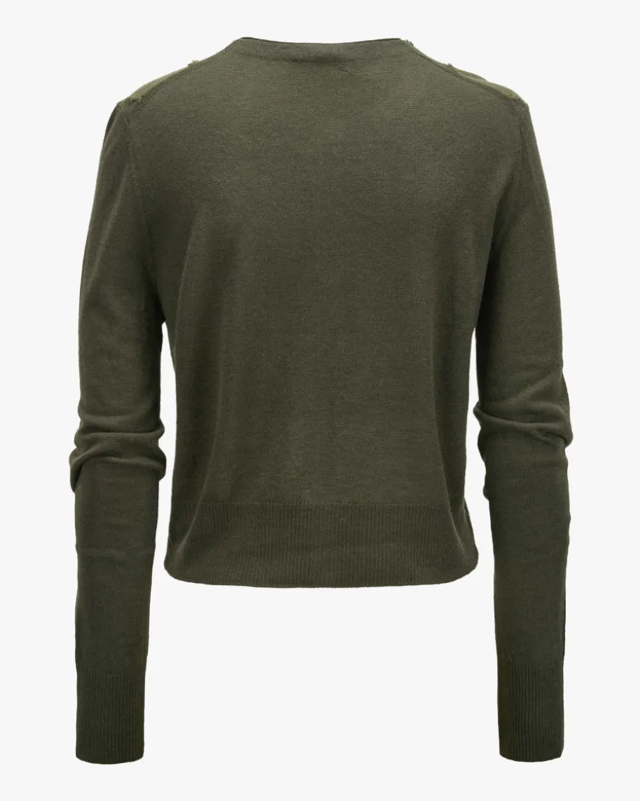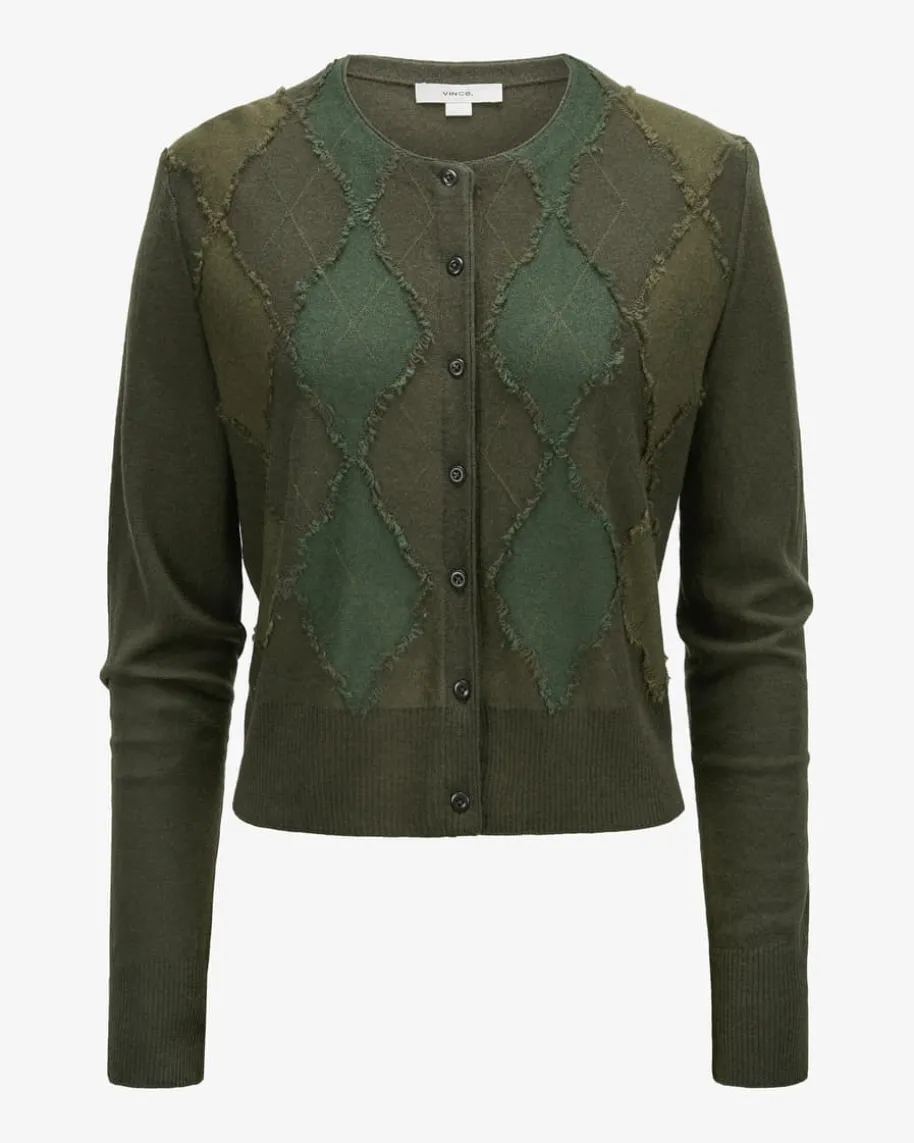 Strickjacke für Damen von Vince in Oliv, Dunkeloliv und Moosgrün. Das Modellpunktet dank dem dünnen Woll-Cashmere-Mix in femininer Aufmachung, während dasRauten-Strick-Dessin mit Fransen-Details entlang der Kanten eine extravaganteNote verleiht.