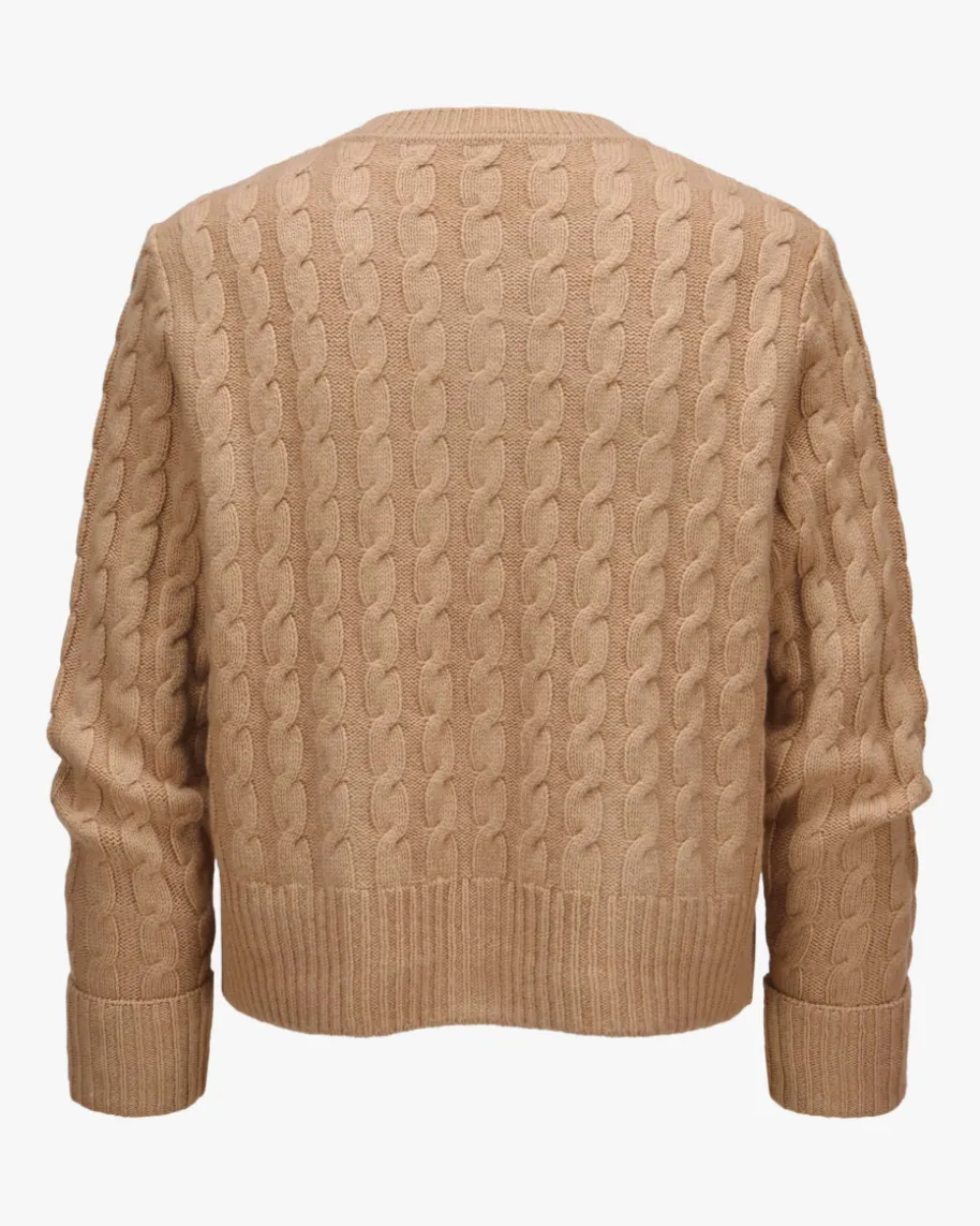 Strickjacke für Damen von Windsor in Camel. Während der hochwertige Schurwoll-Cashmere-Mix eine angenehme Haptik verleiht, kreieren das Zopfstrick-Mustersowie die umgeschlagenen Ärmelbündchen einen modernen Casual-Favoriten. Zugleichsorgt das Pocket-Design zusammen mit der Schulterwattierung für einen besonderenTwist.