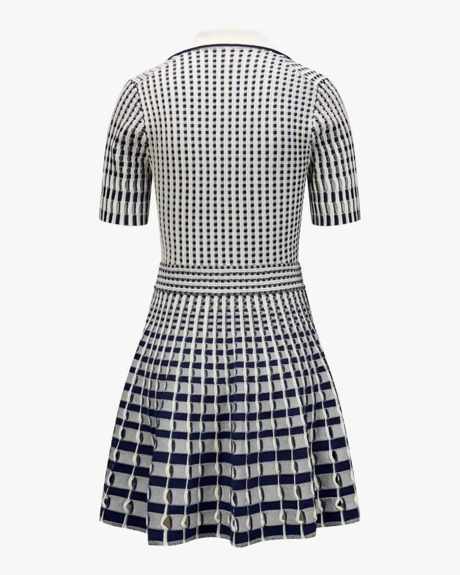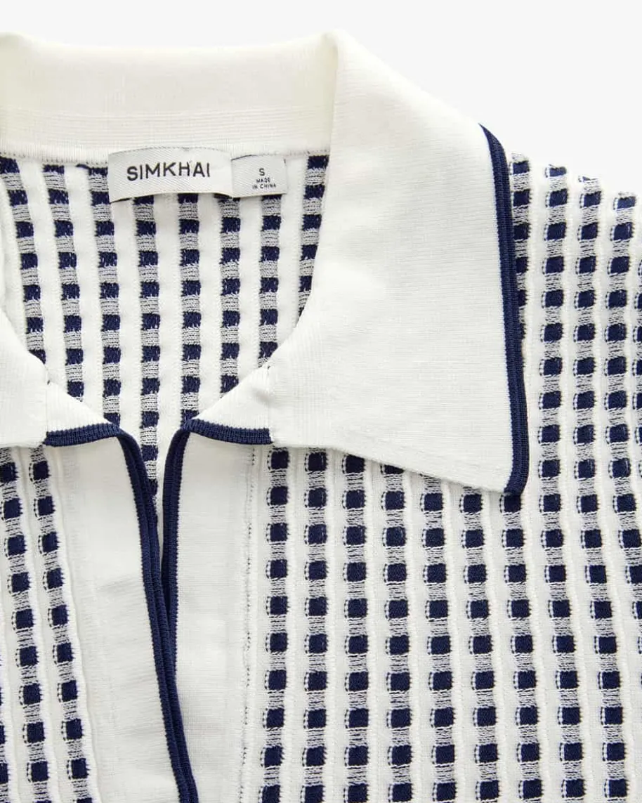 Strickkleid für Damen von Simkhai in Weiß und Dunkelblau. Der aus New Yorkstammende Designer Jonathan Simkhai interpretierte für seine Entwürfe dieVorstellung von femininer Mode neu und verlieh seinen Designs eine sinnliche undkraftvolle Ausstrahlung. Auch dieses Modell präsentiert sich mit raffinierterStrick-Verarbeitung mit grafischem Muster in semi-transparenter Optik. Dermodische Look wird mit dem geschlitzten Polokragen sportiv ergänzt und schaffteinen Style mit dem gewissen Etwas.