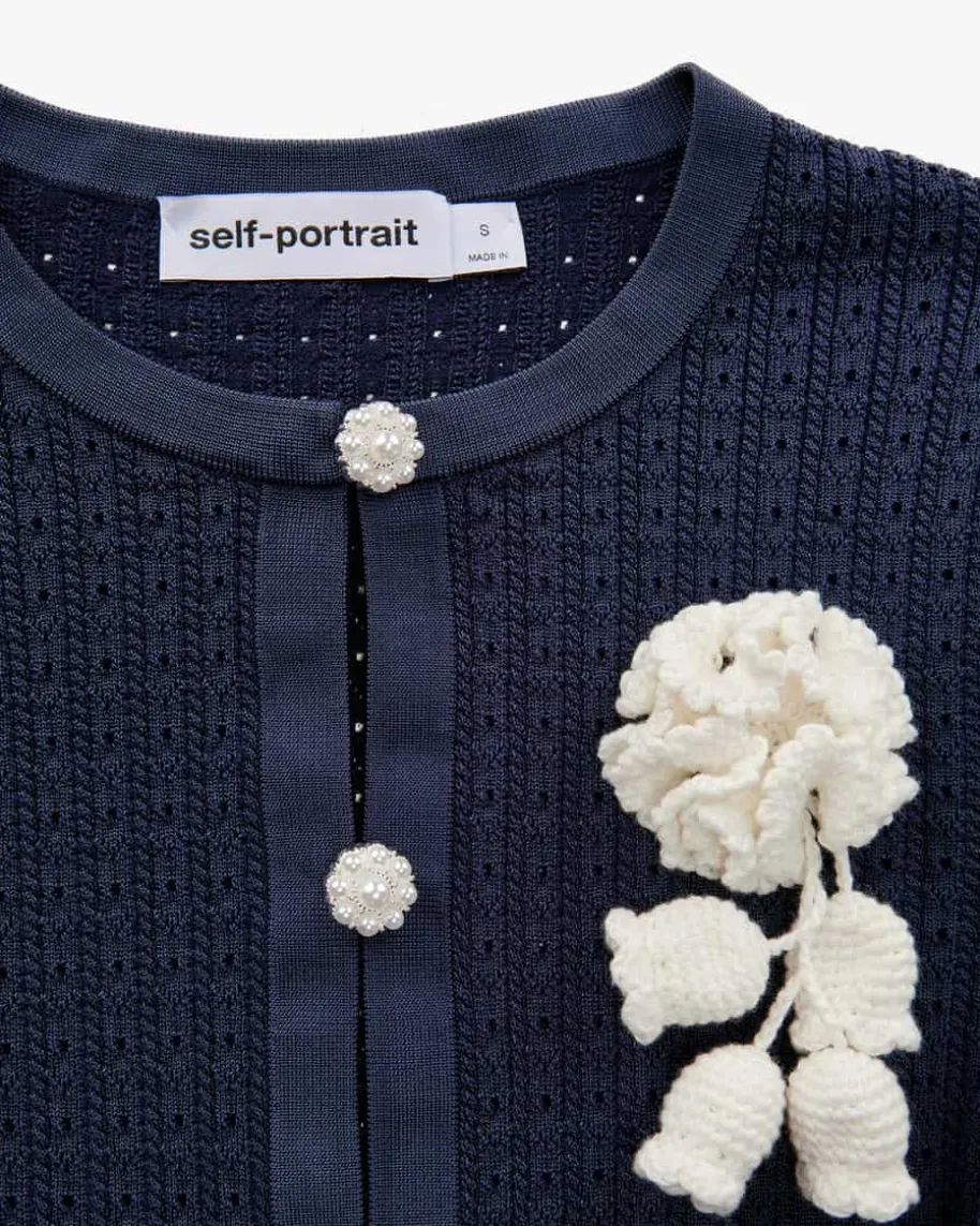 Strickkleid für Damen von Self-Portrait in Dunkelblau. Das Feinstrick-Modellbegeistert mit semi-transparentem Ajour-Strickmuster aus leichtem Viskose-Mix,der für angenehmen Tragekomfort sorgt. Die feminine Silhouette mit ausgestelltemRock und romantischen Rüschenärmeln avanciert dank der Kombination mit elegantenDetails und markanten Schmuckstein-Applikationen zum modischen Strick-Lieblingmit dem gewissen Etwas.