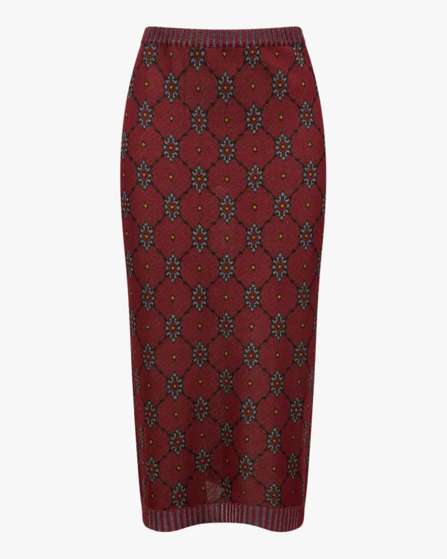 Strickrock für Damen von Etro in Dunkelrot, Blaugrau und Gelb. Dank desmodischen Allover-Dessins besticht das Modell in stilvoller Aufmachung, währendder elastische Bund Komfort verspricht.